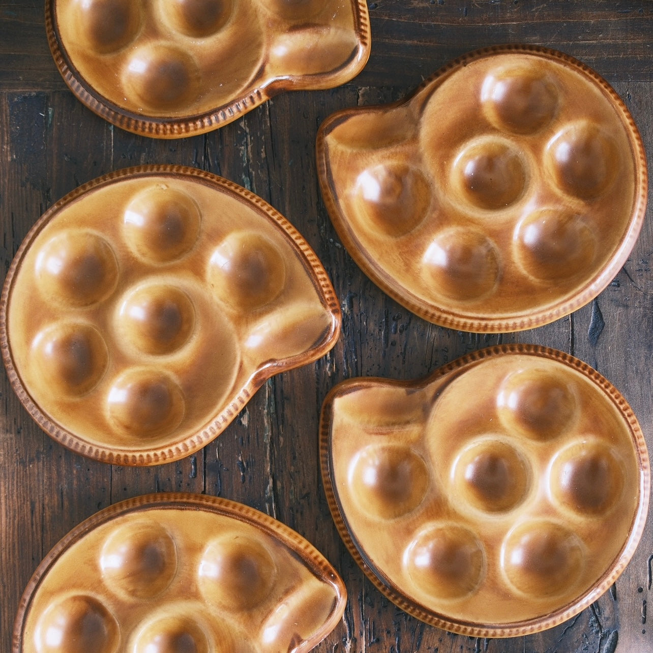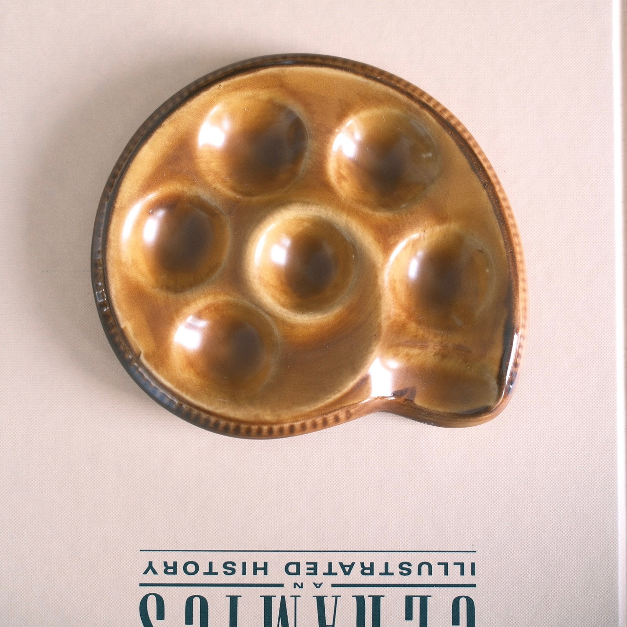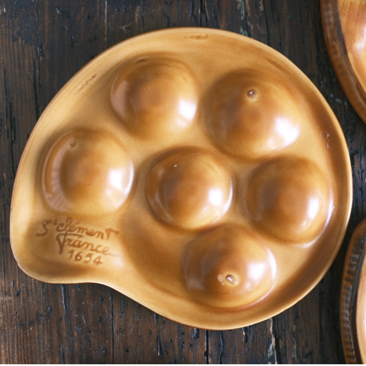 Ett brunt äggfat i keramik för 6 ägg från Frankrike.