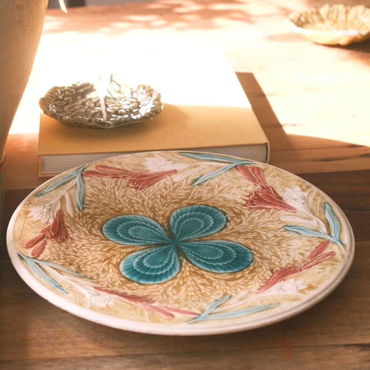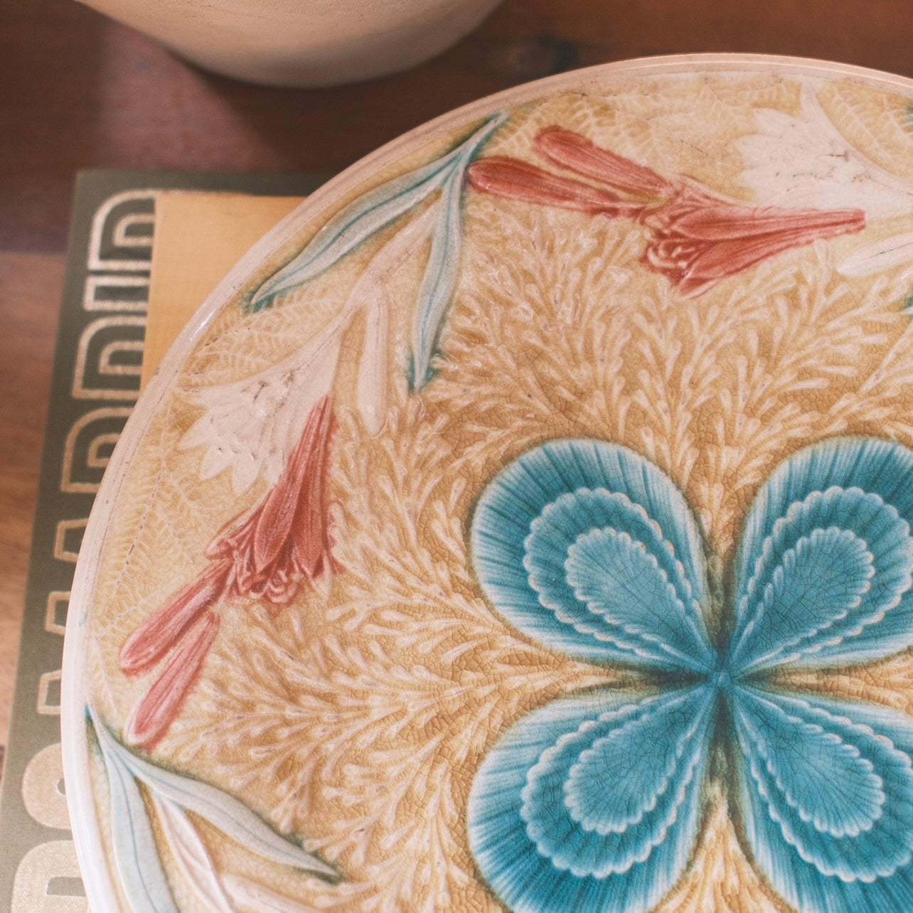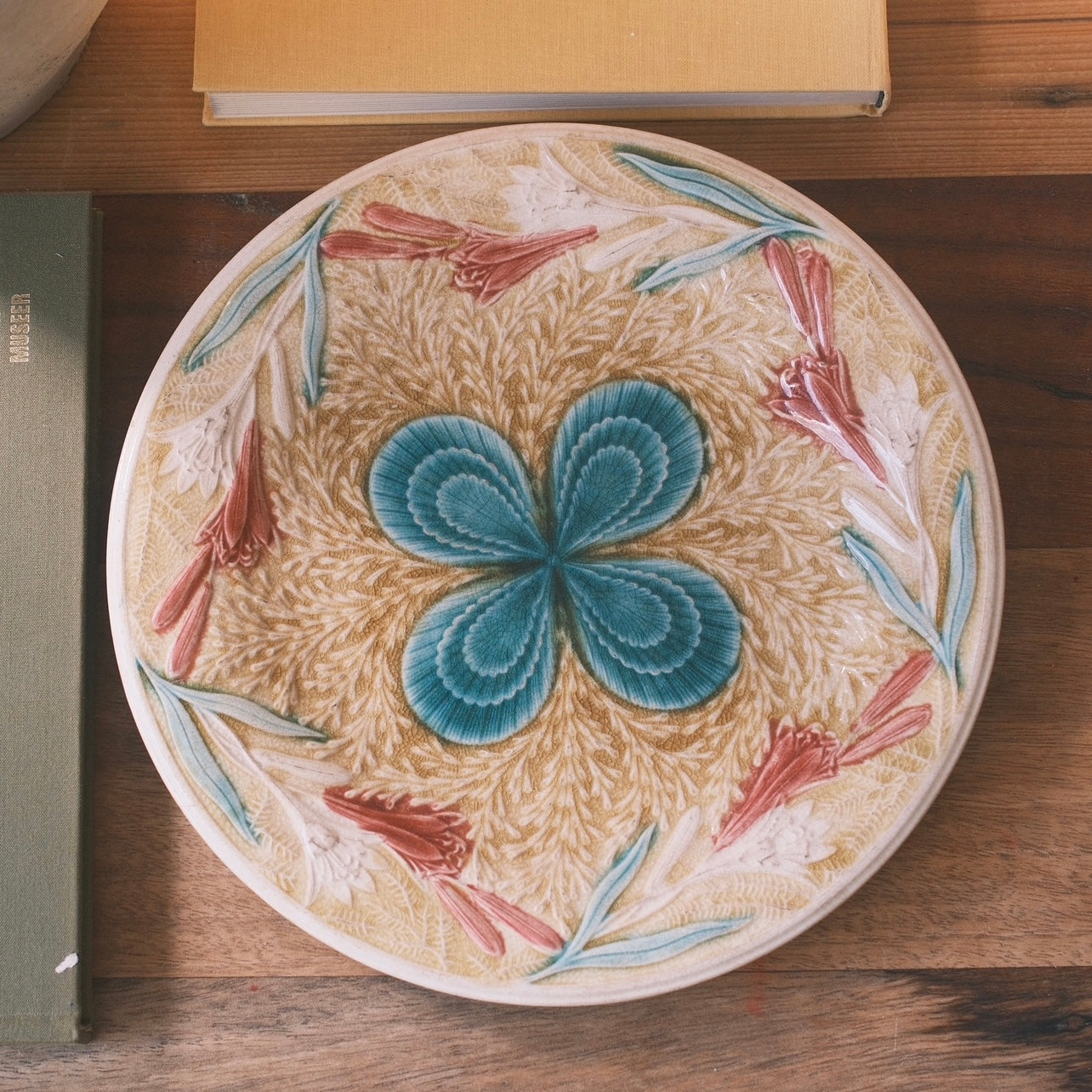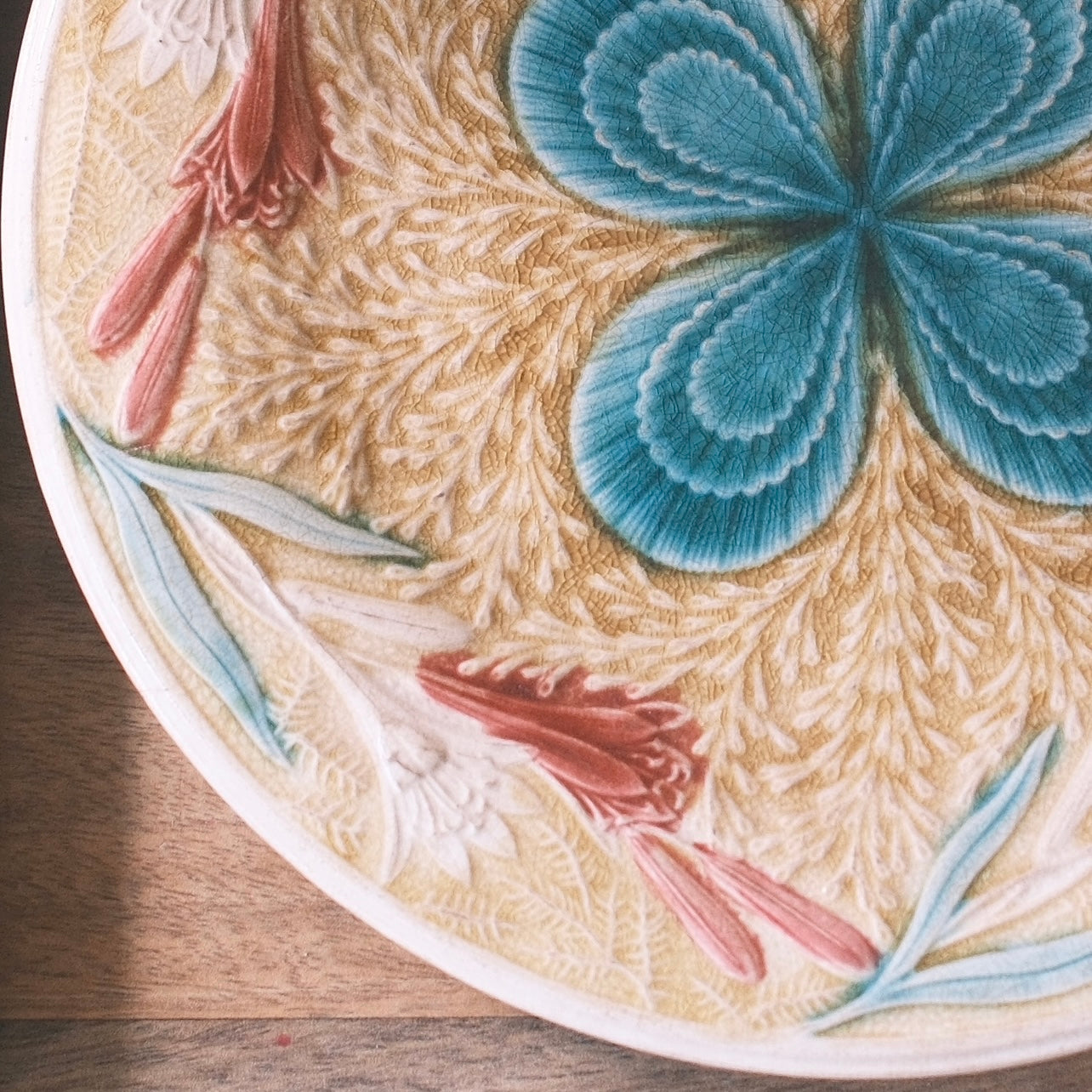 Fat i majolika stil med en blomkrans och en stor blomma i mitten. Otroligt vackra färger som slår i grönt och gul.
