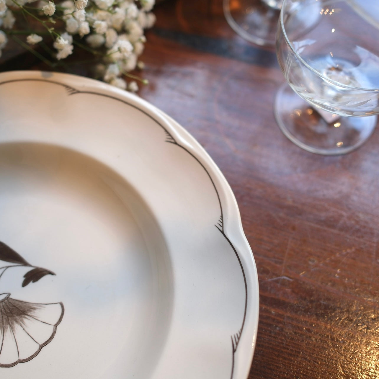 En djup tallrik som passar att såväl äta pasta, soppa eller varför inte frukostgröten. Med sin vågiga eleganta kant följt av svartbruna detaljer med en vacker blomma i mitten.