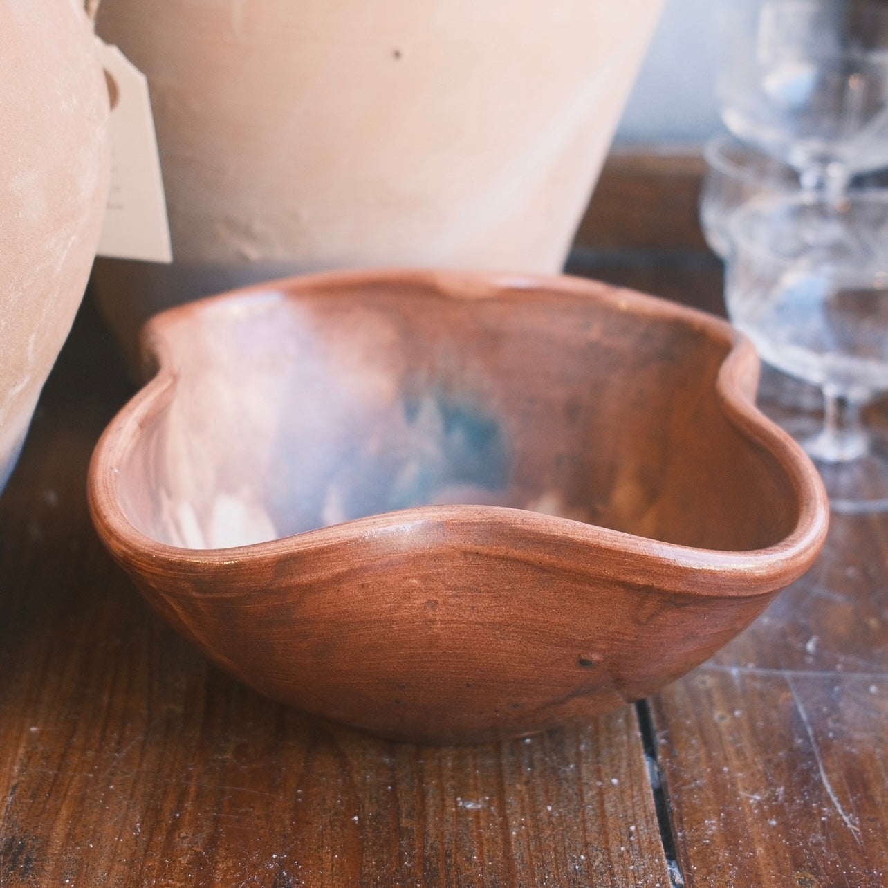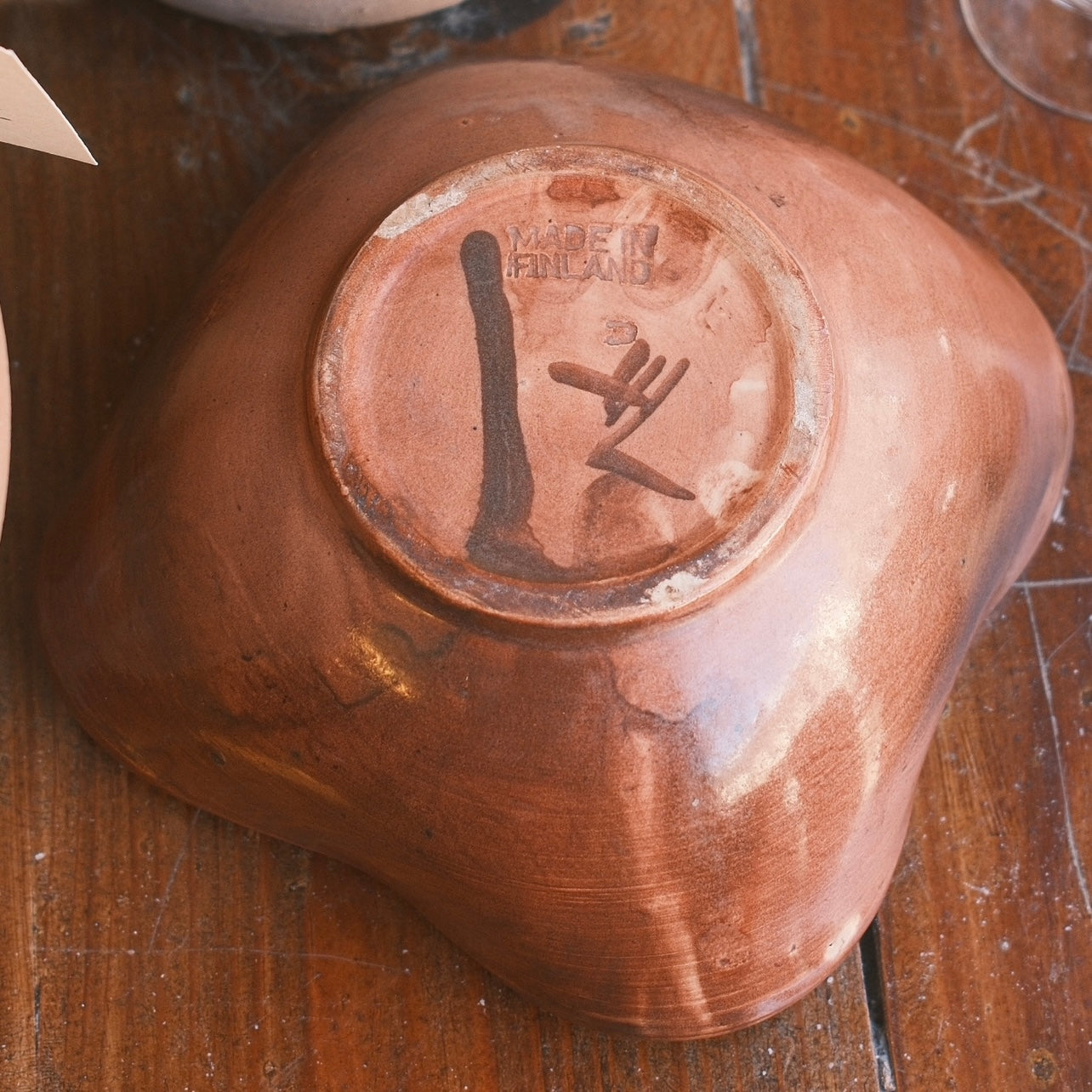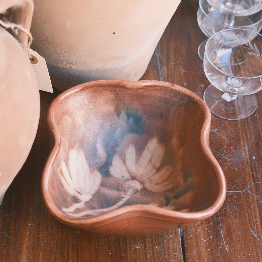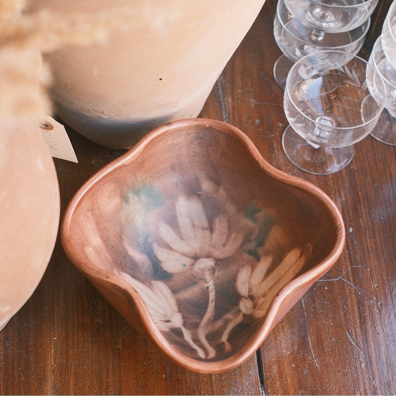 Fyrkantig brun tonad skål i keramik med dekorativa handmålade blommor på insidan och en unik charmig fyrkantig form form.