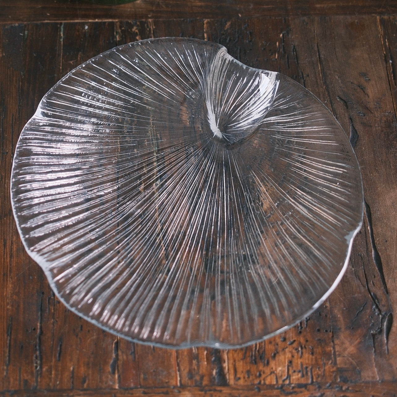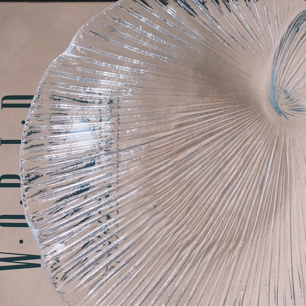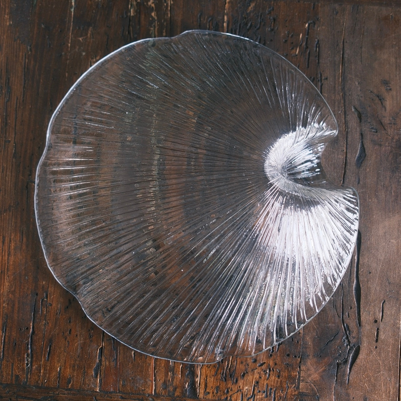 Ett stort fat i pressglas formad som en snäcka från Pukeberg firma svensk tenn ”60-70” tal.