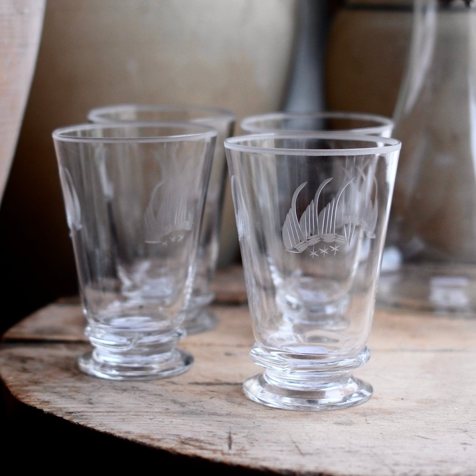 Dessa vintage selterglas är från den svenska serien "Uarda", även känd som "Skeppet", tillverkade vid Johansfors glasbruk och designade av Gunnar Gruno Håkansson. Vattenglasen har en slipad dekor i form av ett skepp.