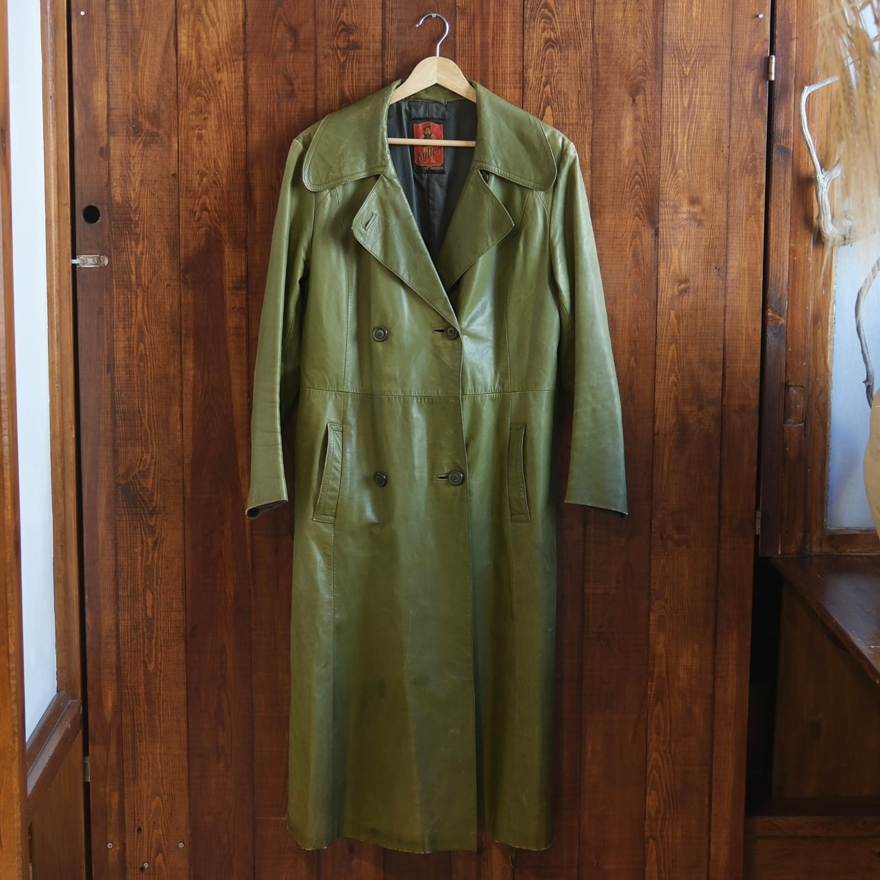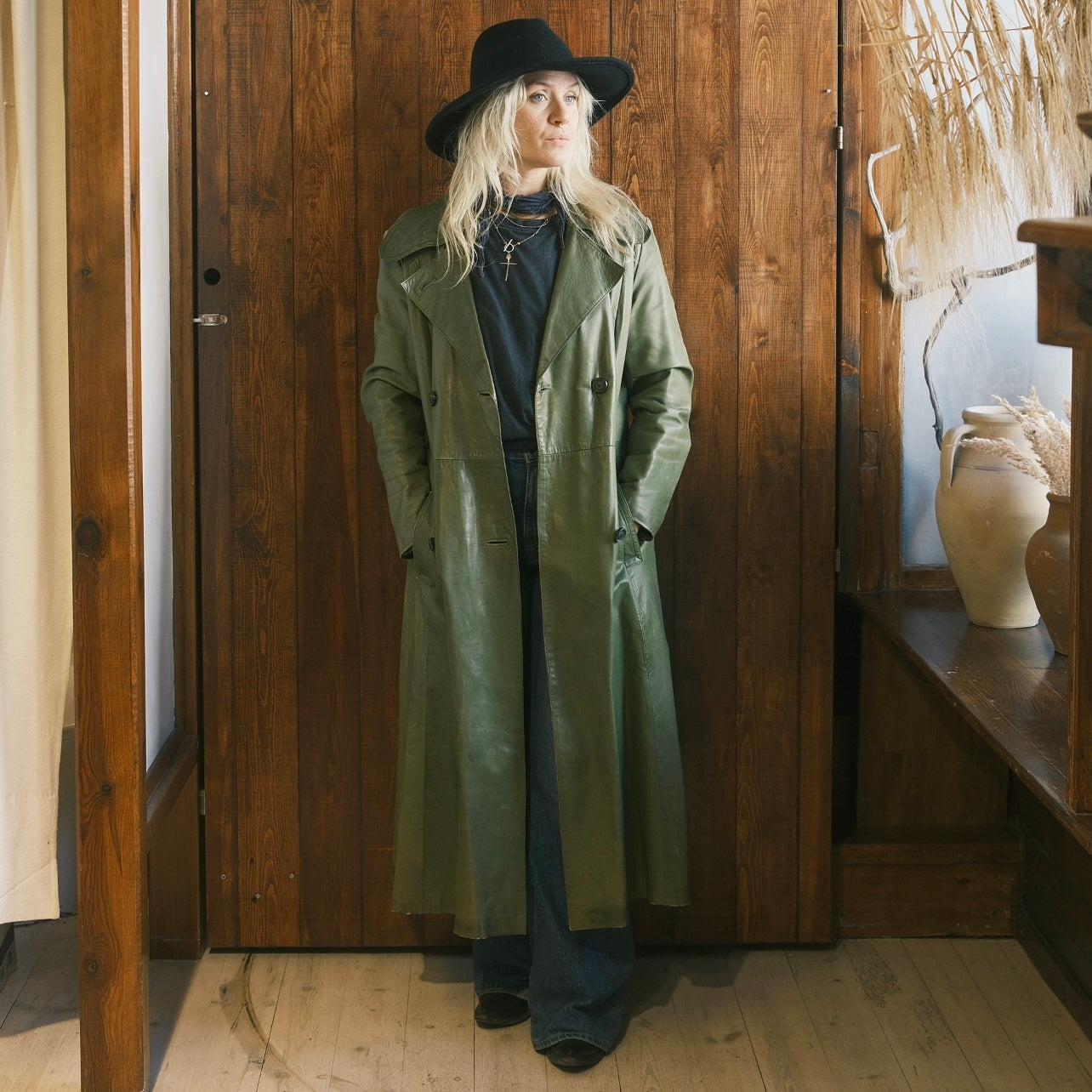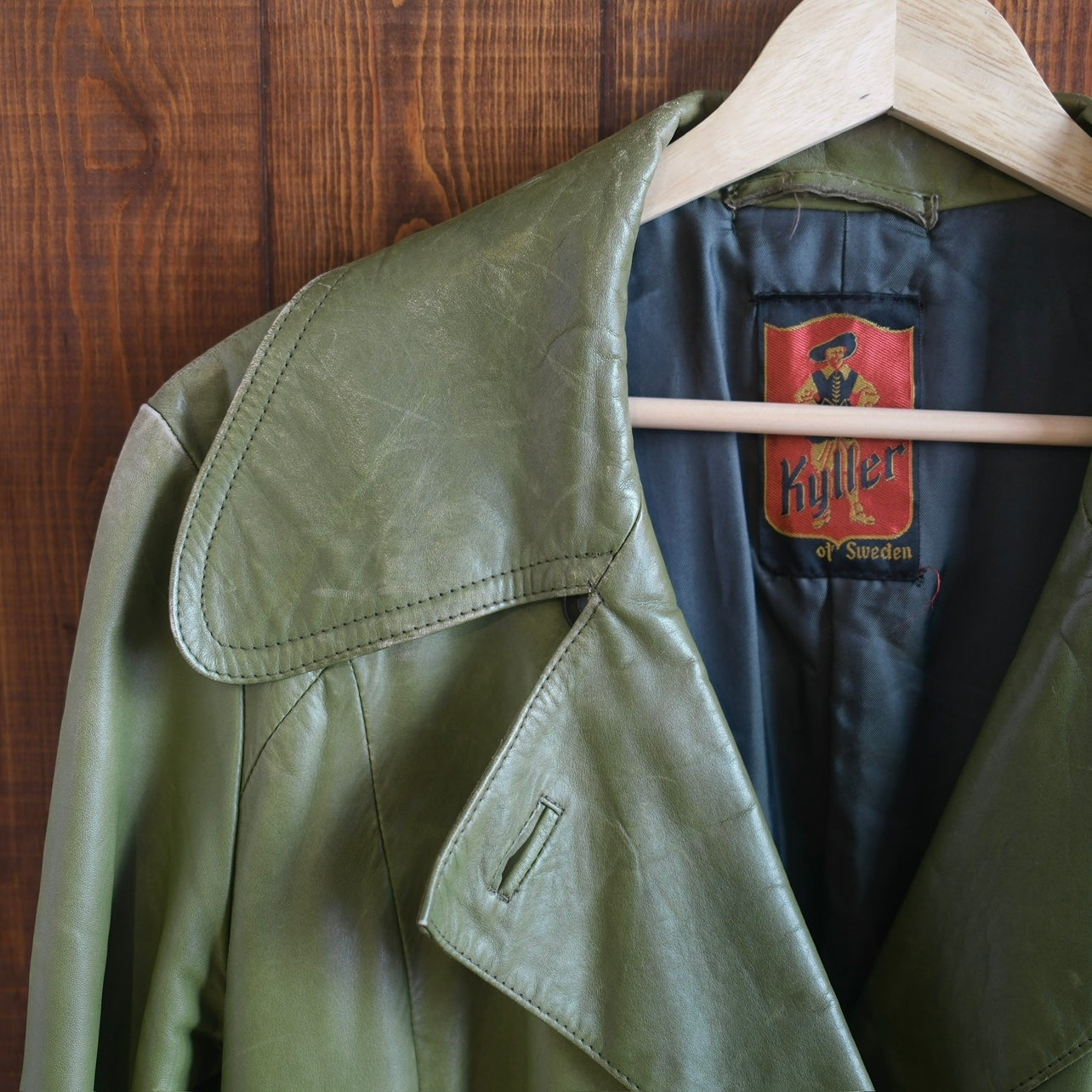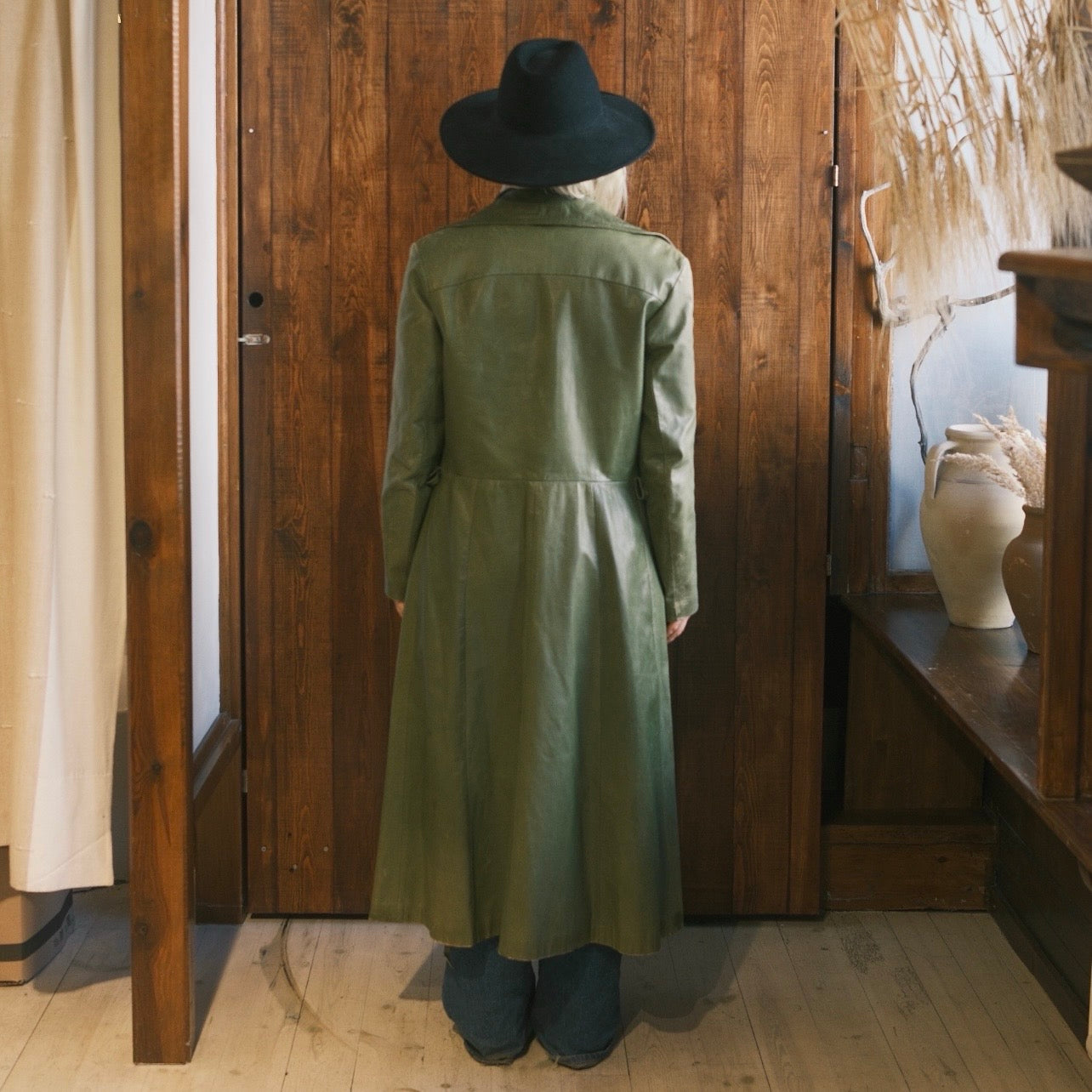 Skinnkappa i vacker grön färg med knappar framtill och stora beslag. Jackan har även ett tunt skärp man kan sätta i midjan. Otroligt hantverk gjord i Sverige.