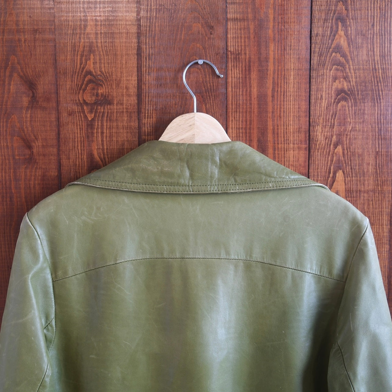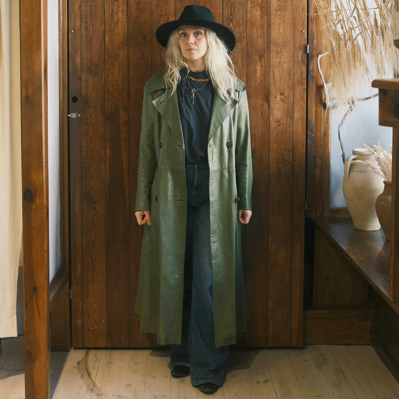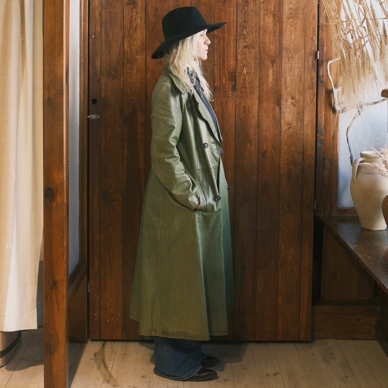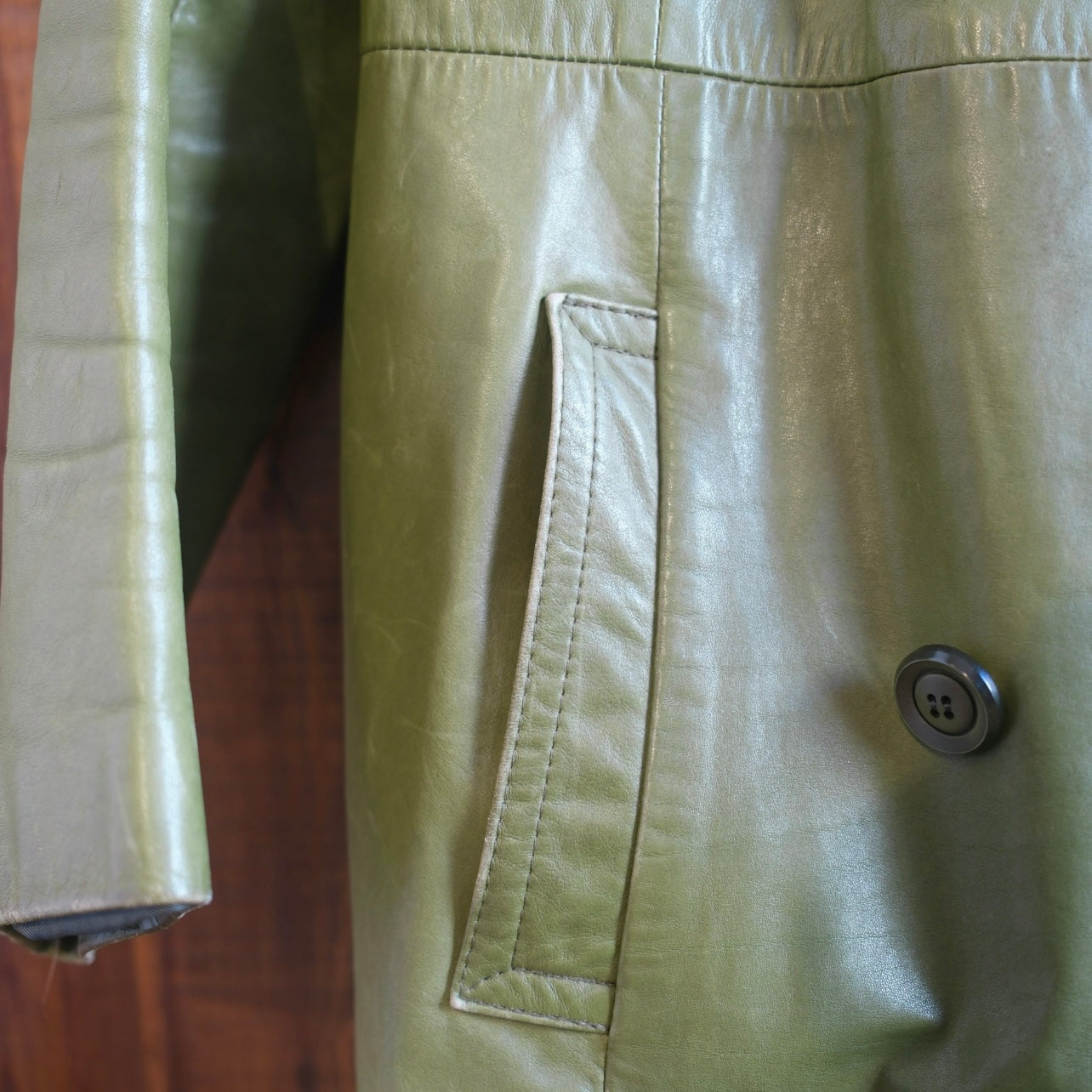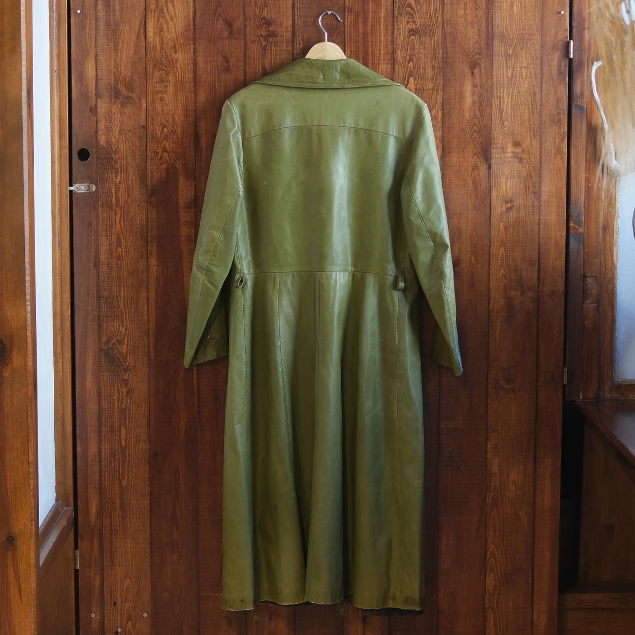 Skinnkappa i vacker grön färg med knappar framtill och stora beslag. Jackan har även ett tunt skärp man kan sätta i midjan. Otroligt hantverk gjord i Sverige.