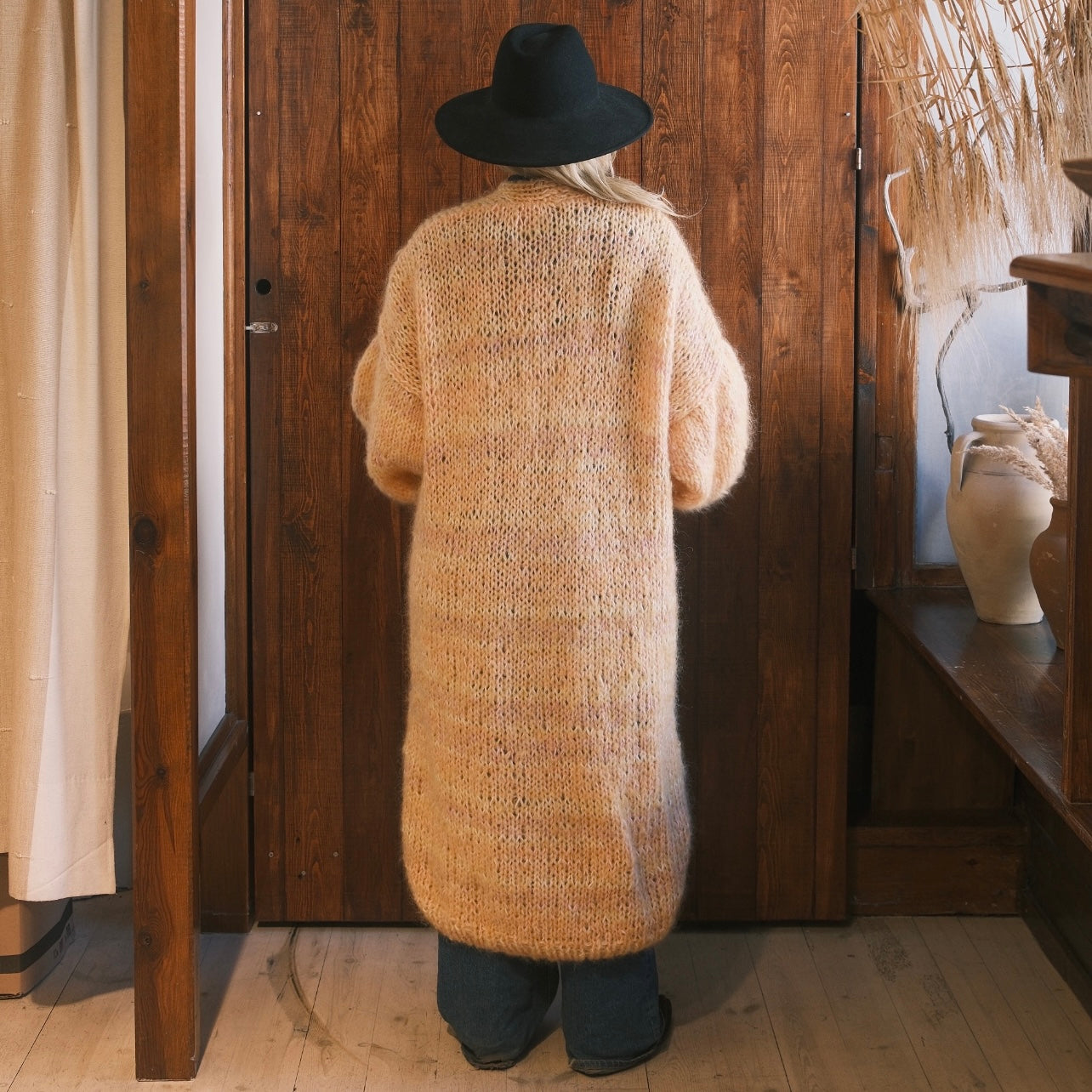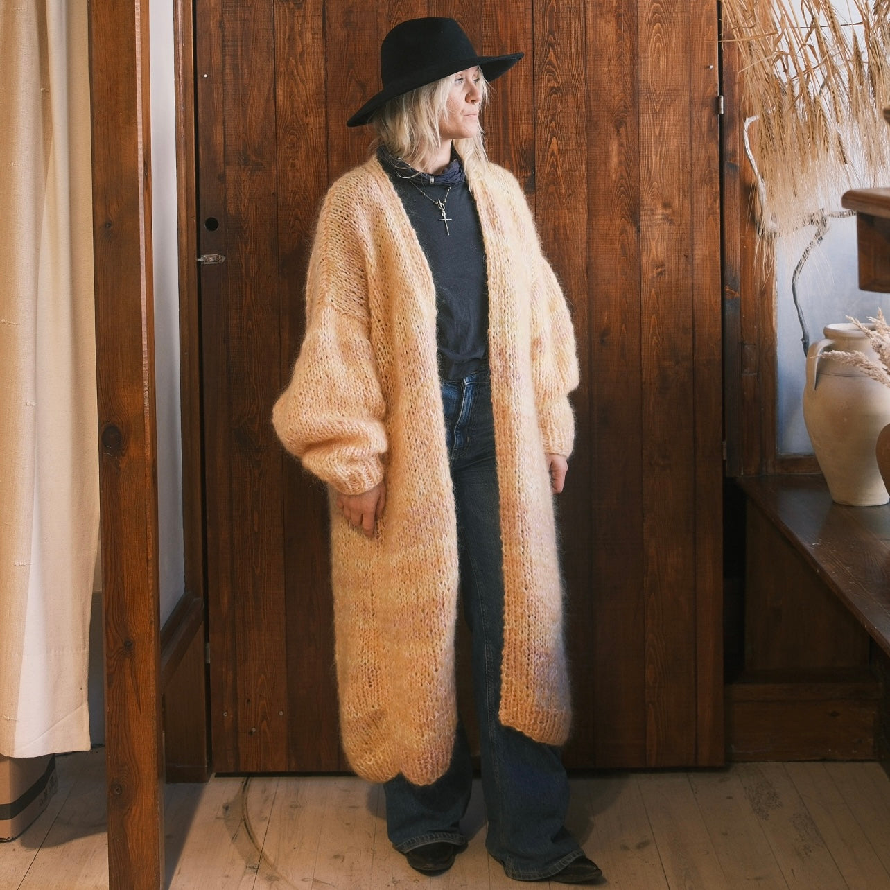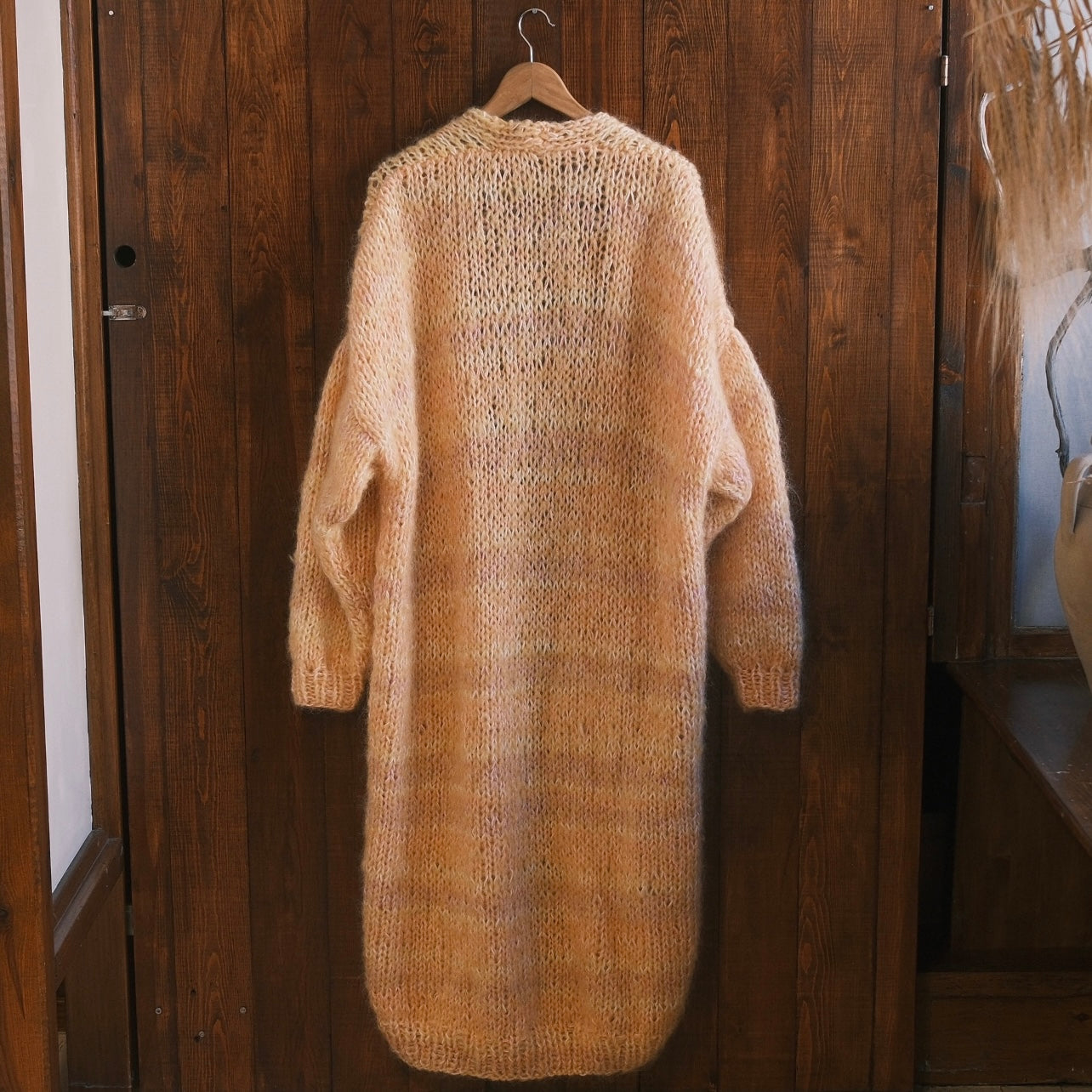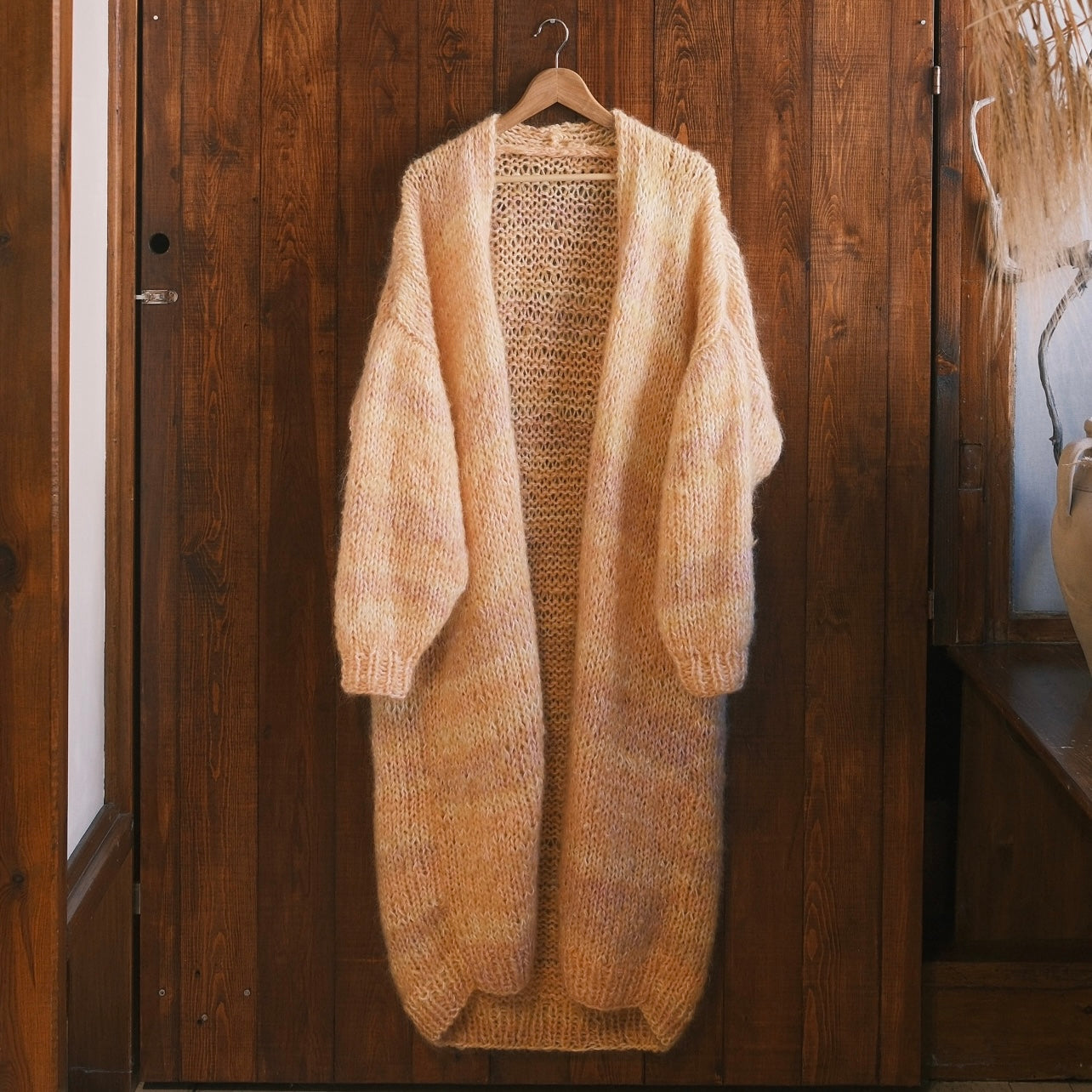 Denna helt unika handstickade lång kofta gjord på vintage garner av olika material är ett hantverk gjord av oss på Kyllaj studio. Vi har samlat vintage garner under ett års tid för att hitta den perfekta kombinationen och gjort en helt unik värmande kofta. Koftan har en varm gul ton med inslag av rosa, lila, peach och vit.
