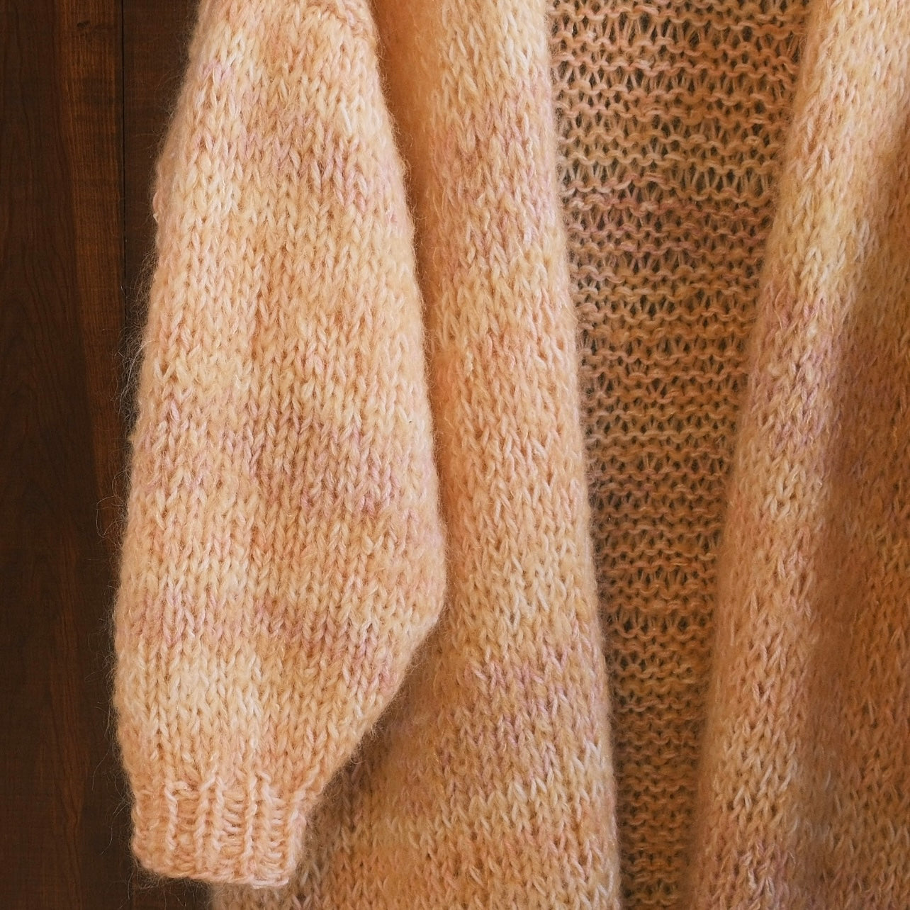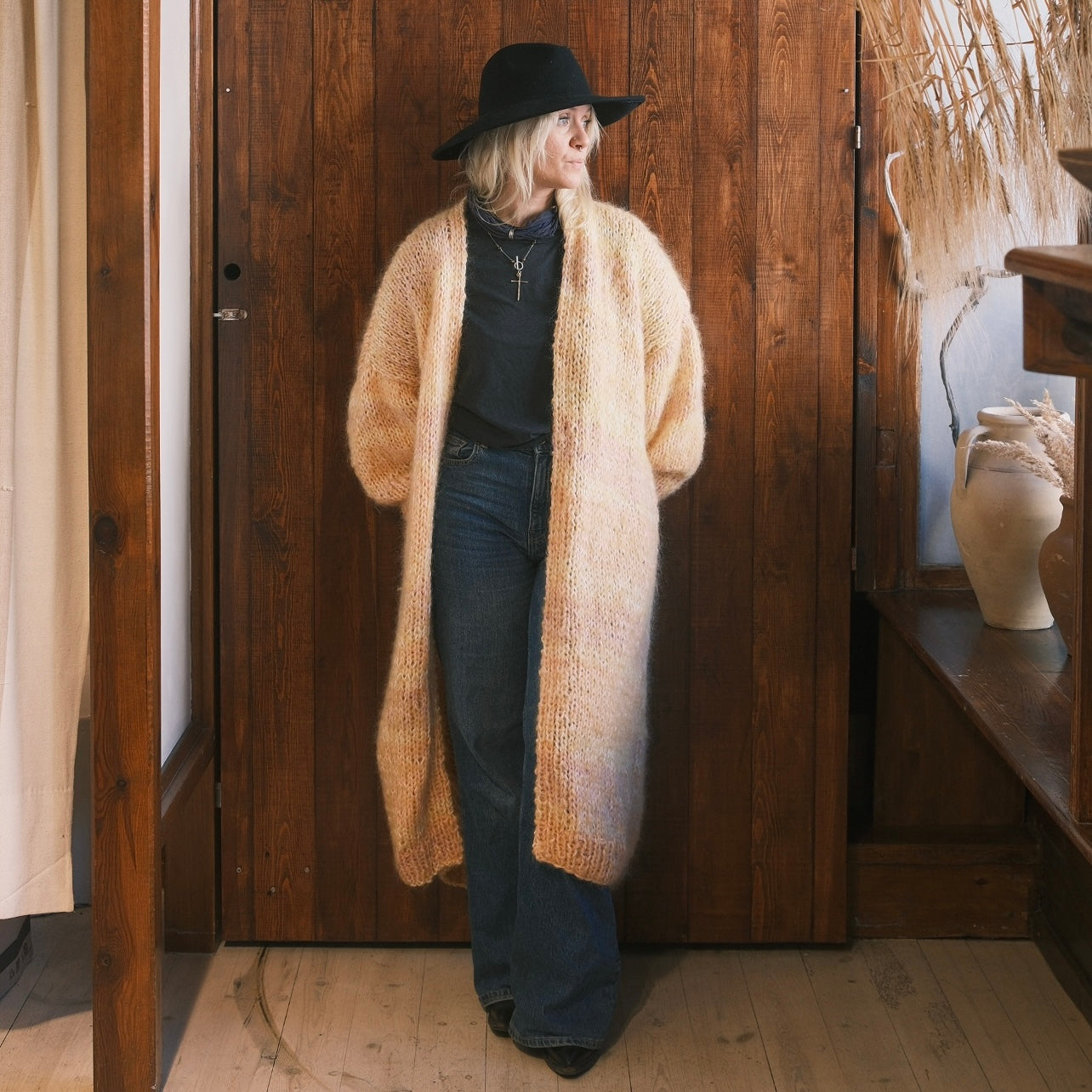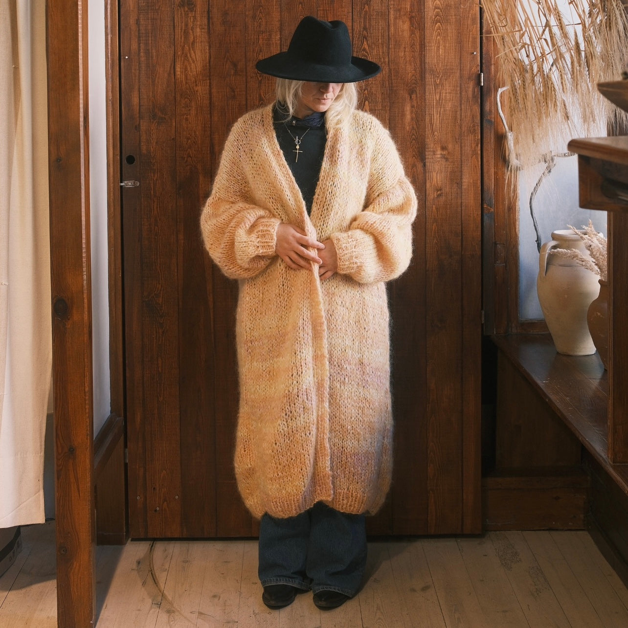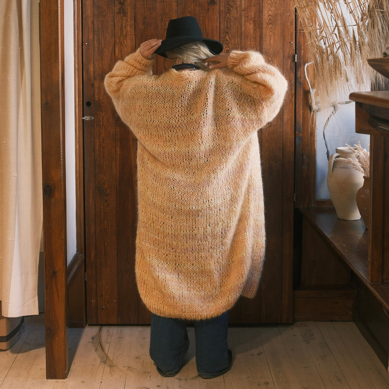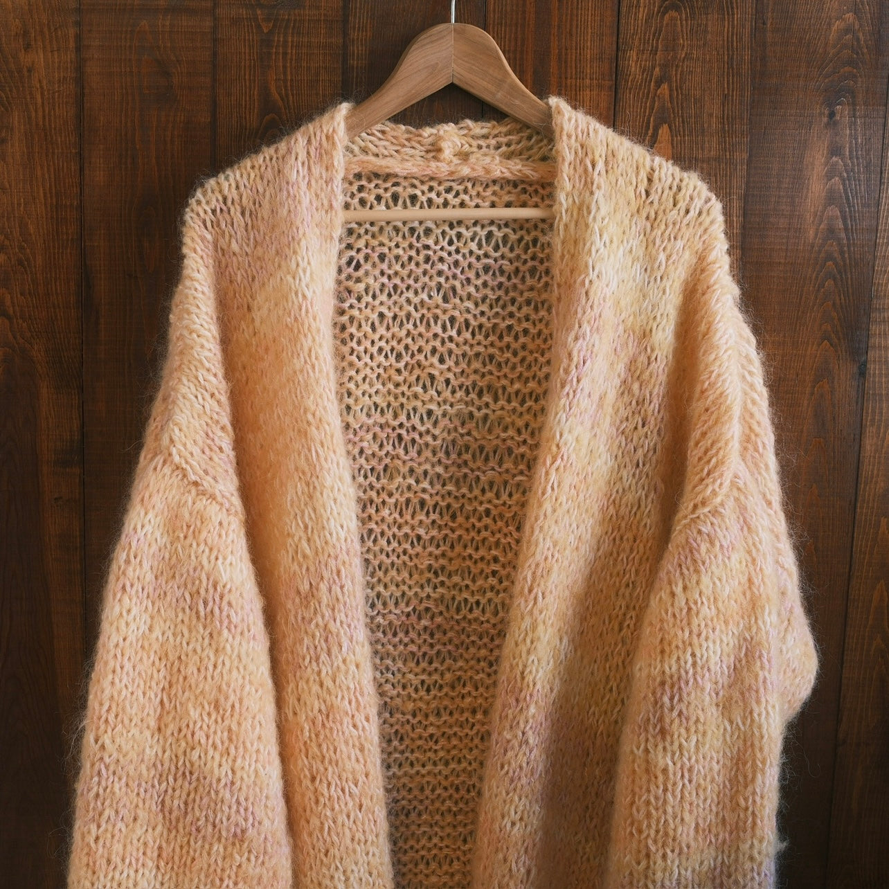 Denna helt unika handstickade lång kofta gjord på vintage garner av olika material är ett hantverk gjord av oss på Kyllaj studio. Vi har samlat vintage garner under ett års tid för att hitta den perfekta kombinationen och gjort en helt unik värmande kofta. Koftan har en varm gul ton med inslag av rosa, lila, peach och vit.