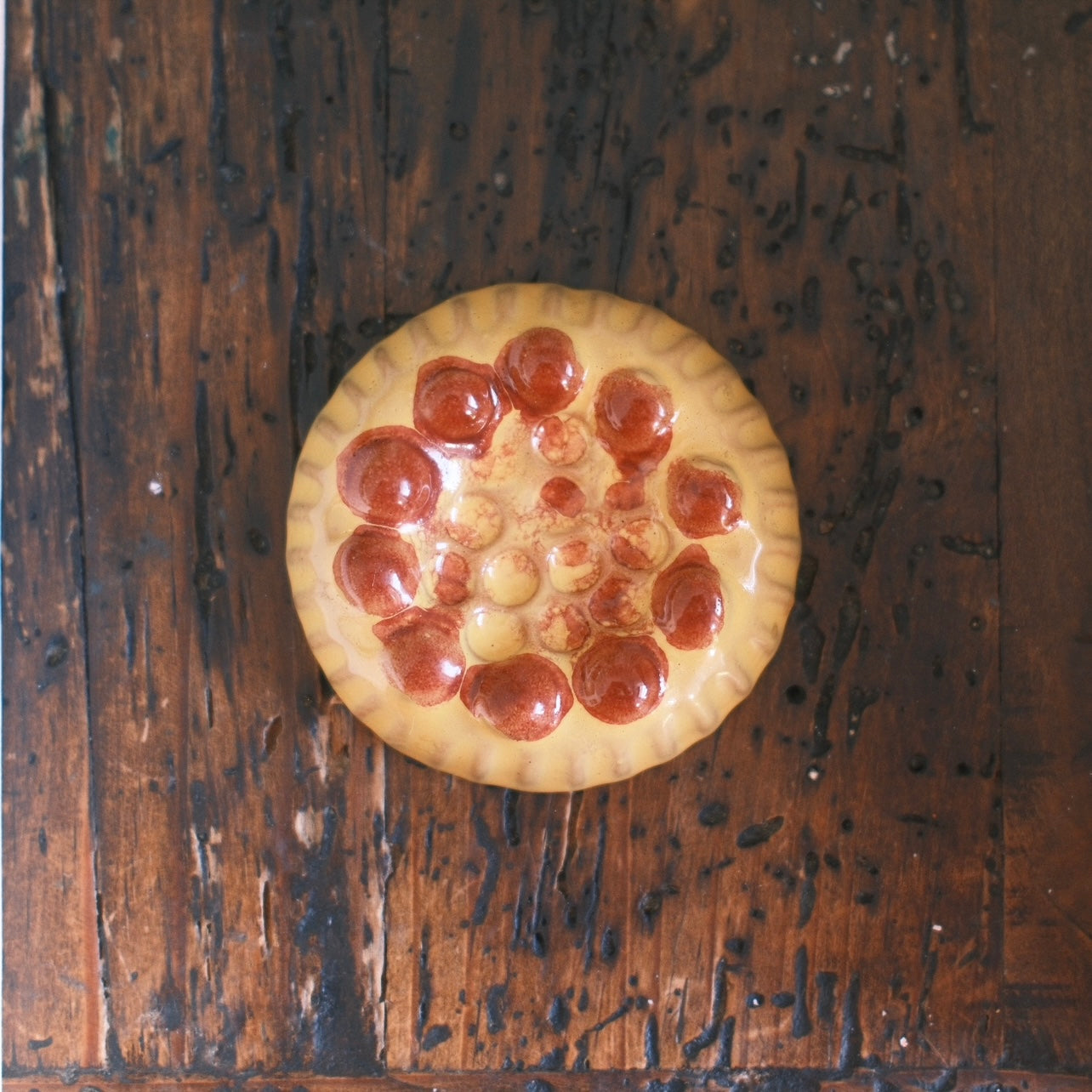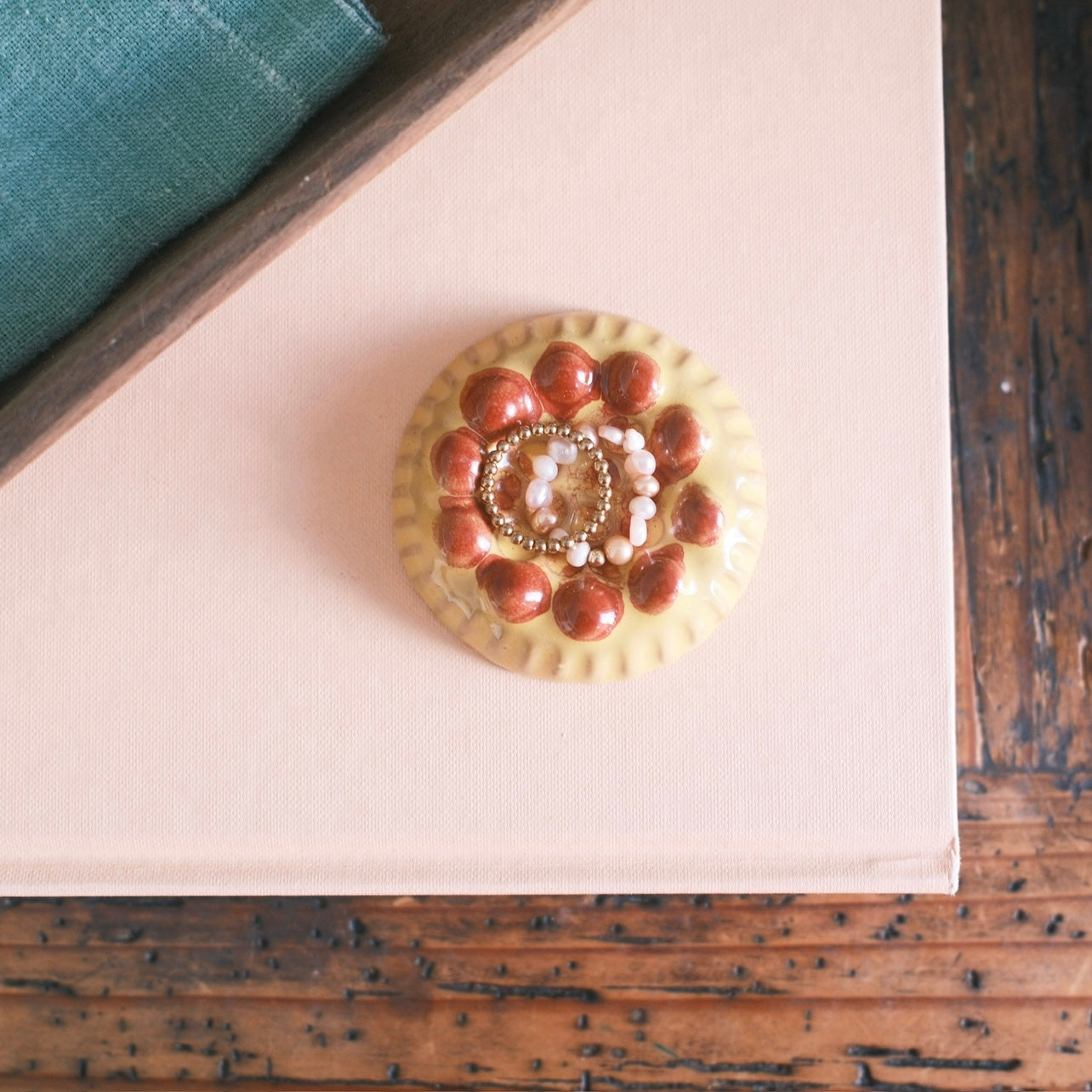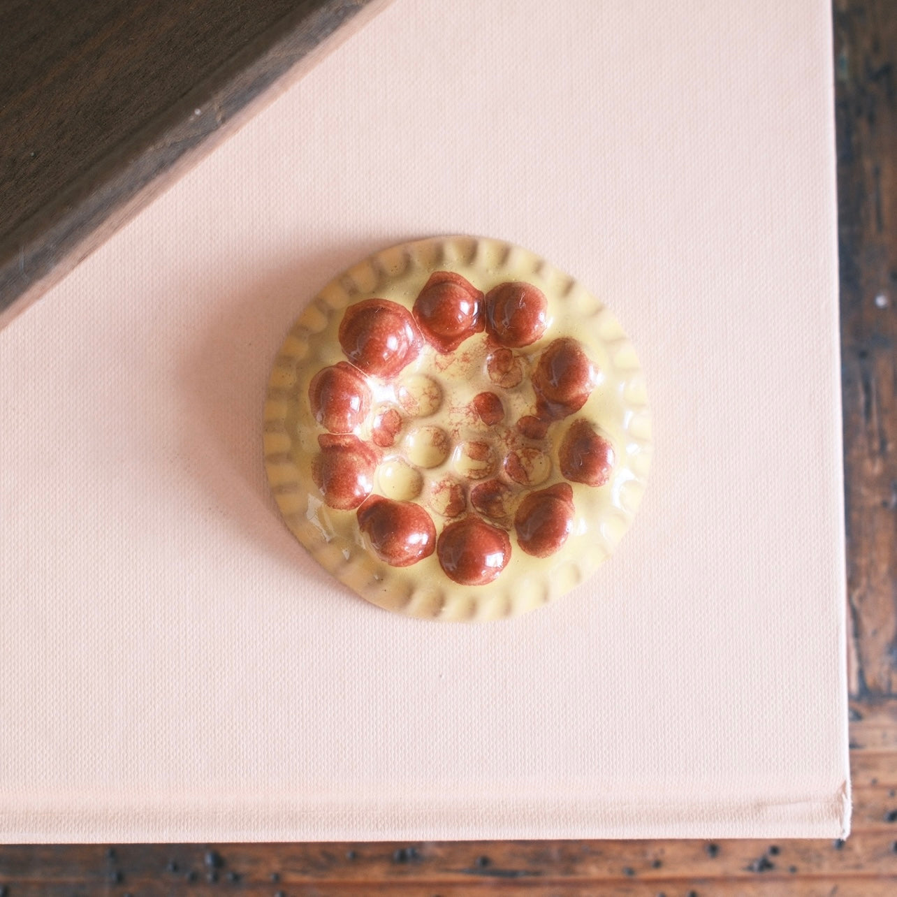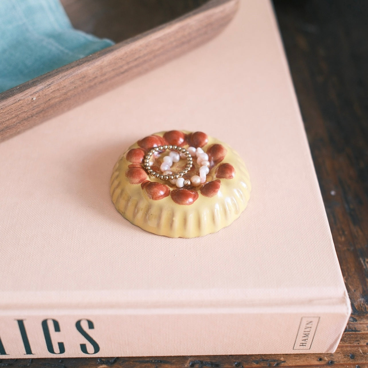 En liten blomma gjord av keramik med gul glasyr och röda prickar, perfekt att använda som smörkniv ställ eller att förvara sina mindre smycken så som ringar eller tunna halsband.