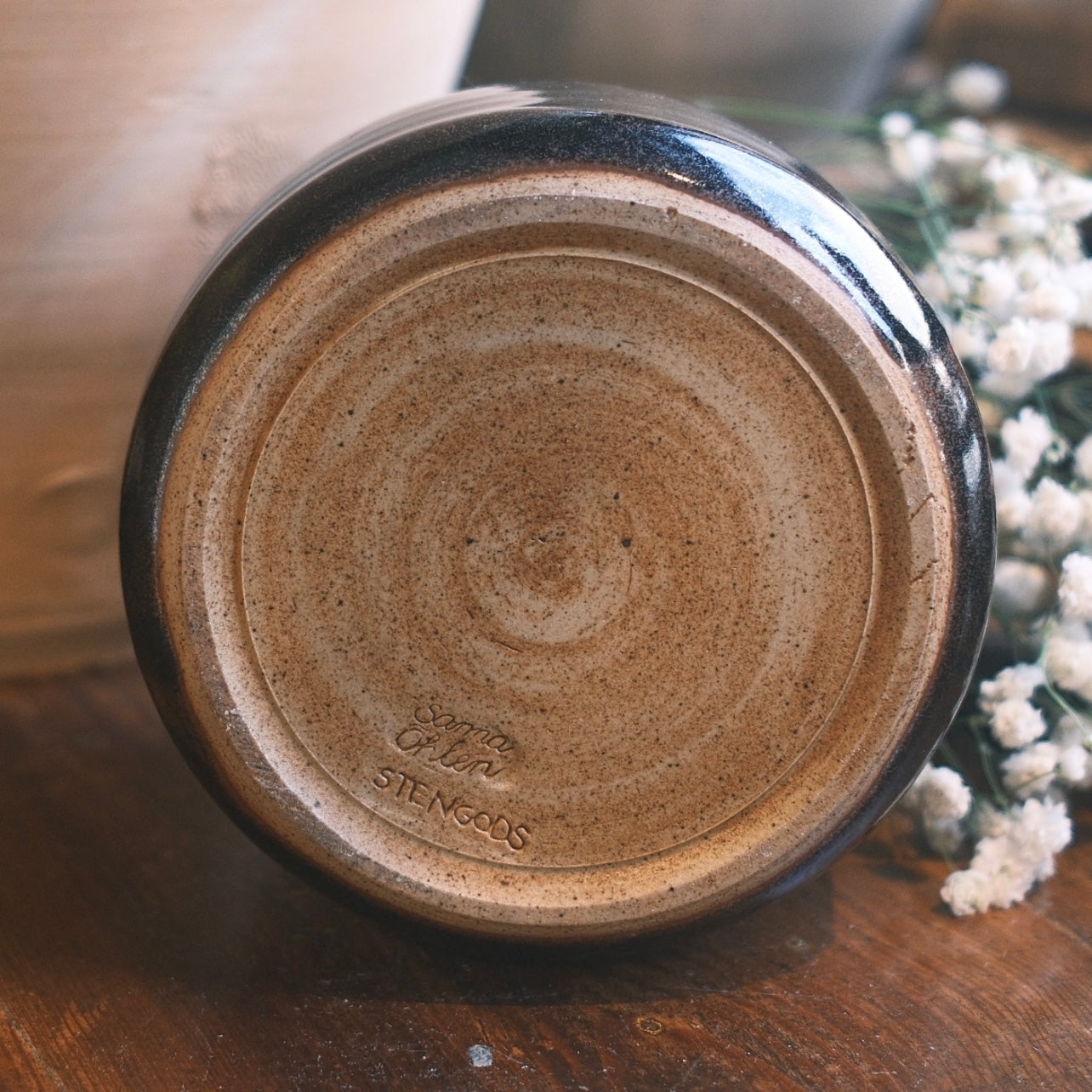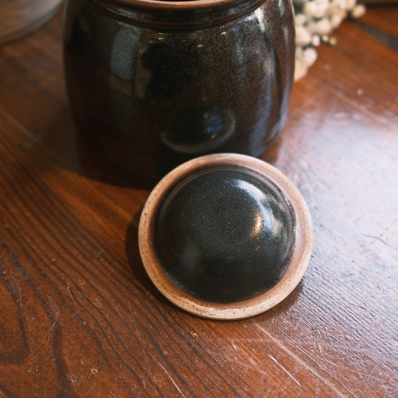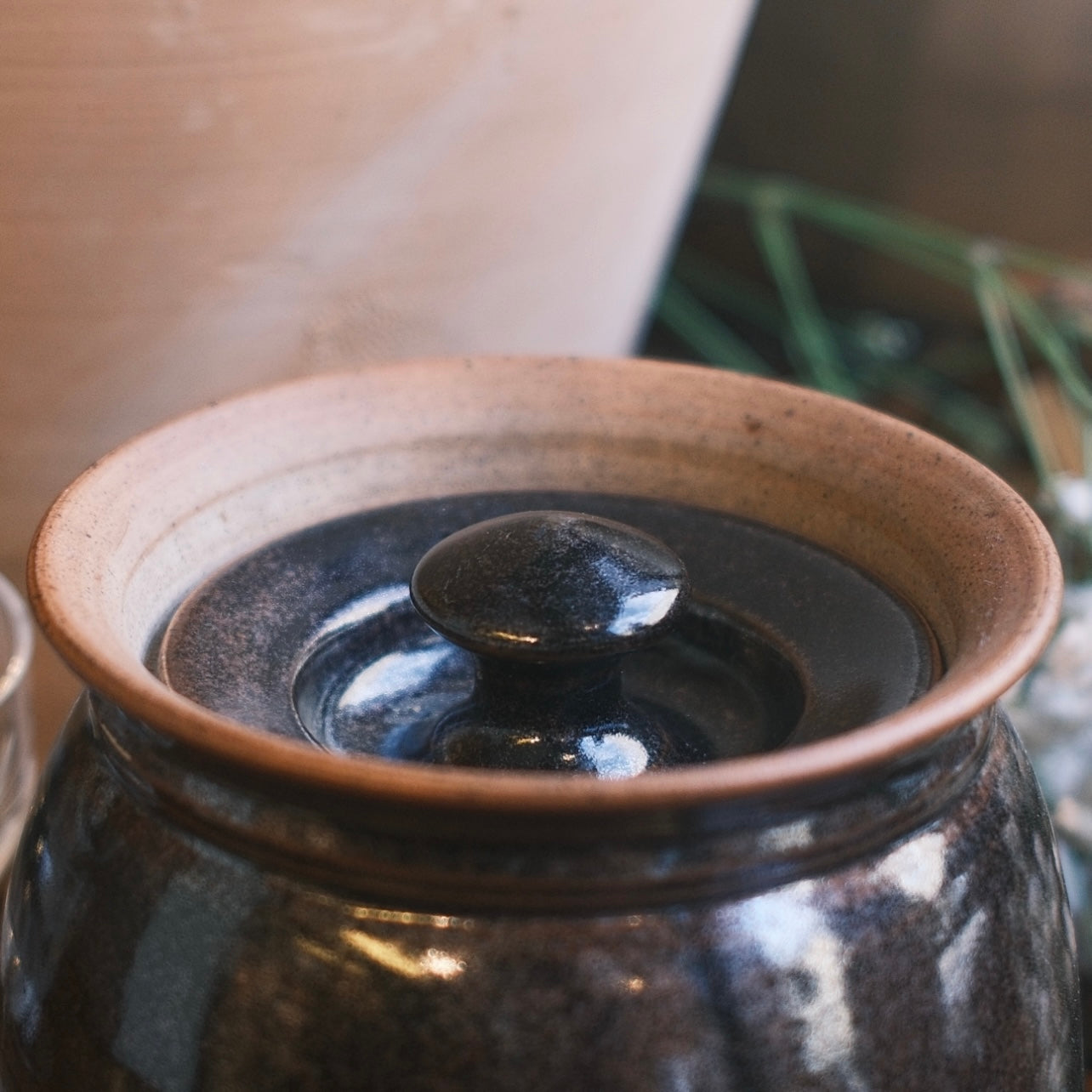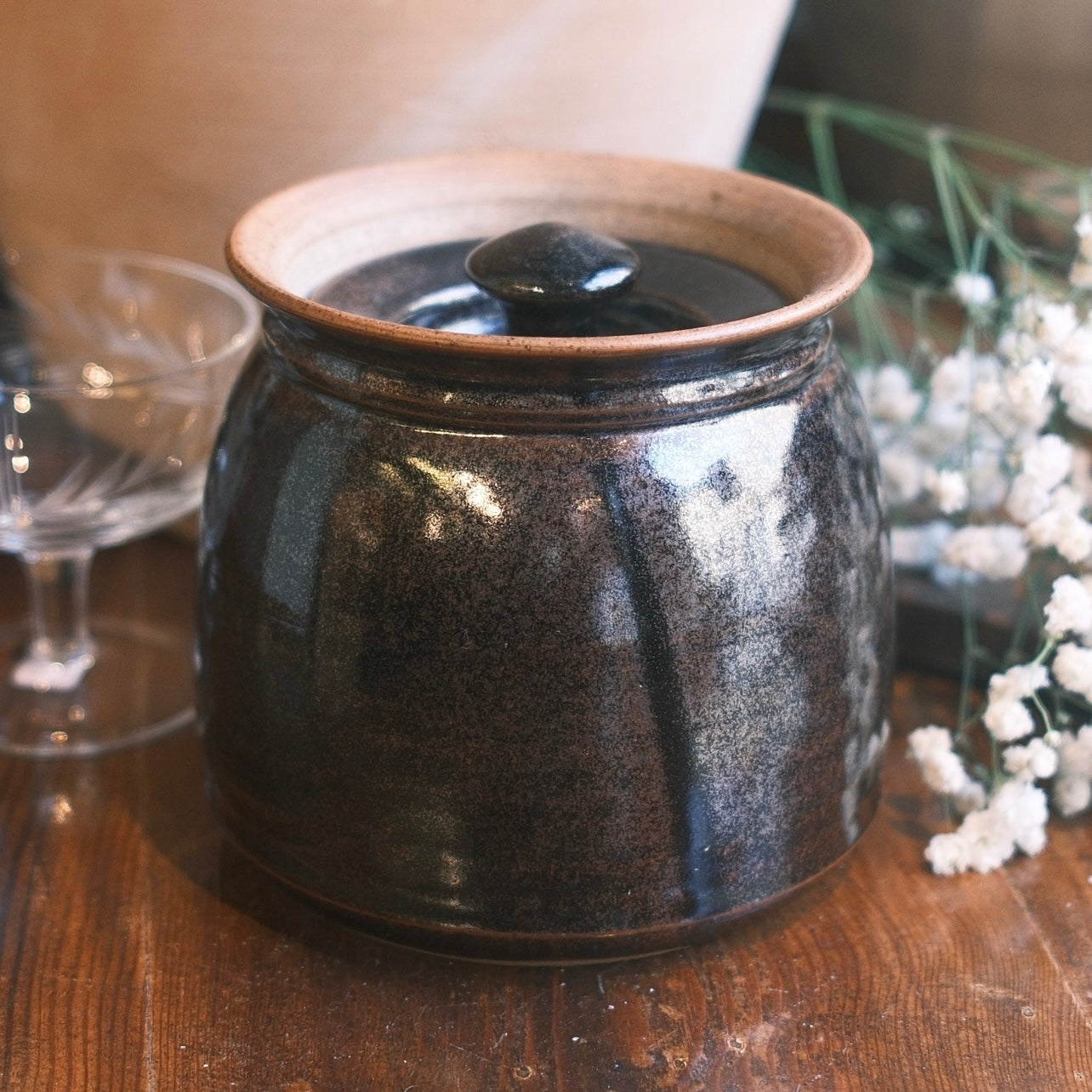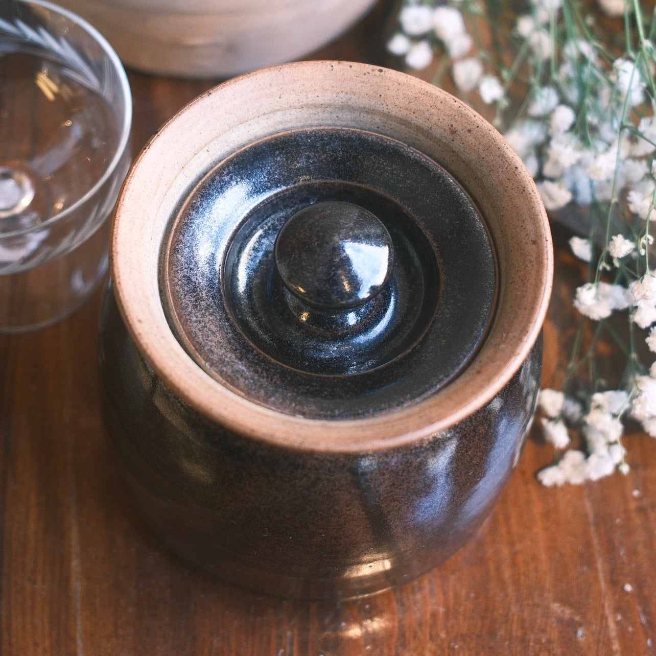 Keramik burk med ett vackert dekorativt lock som sitter nedanför burkens kant. Burken har en svartbrun ton med detaljer i glasyren från Sanna Öhlin gjord i stengods.