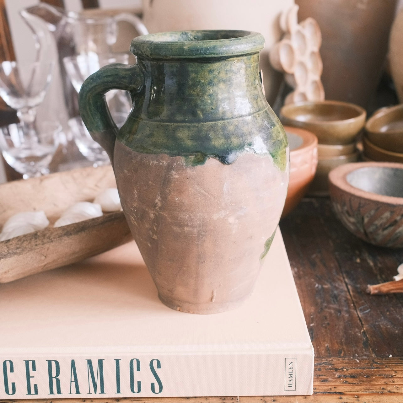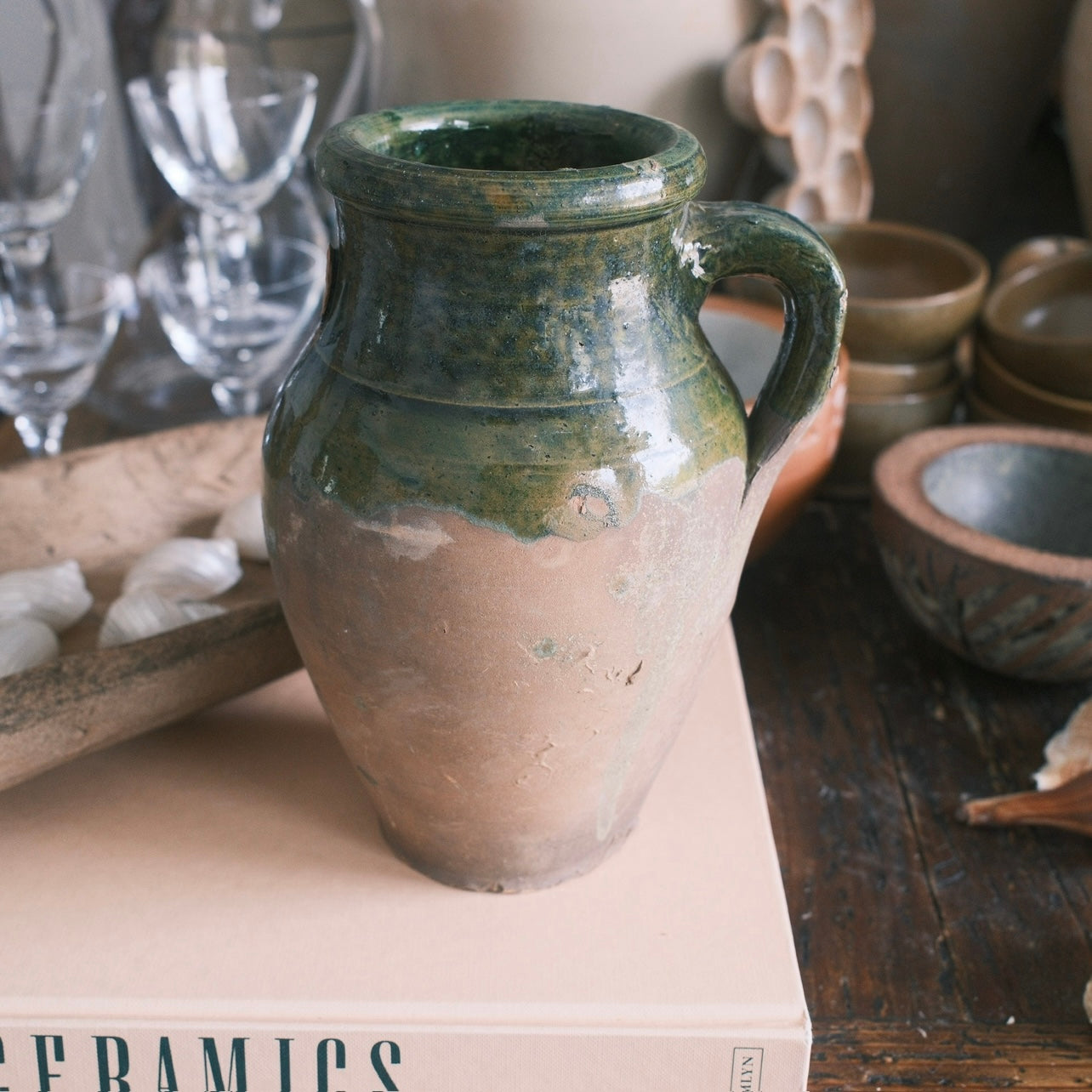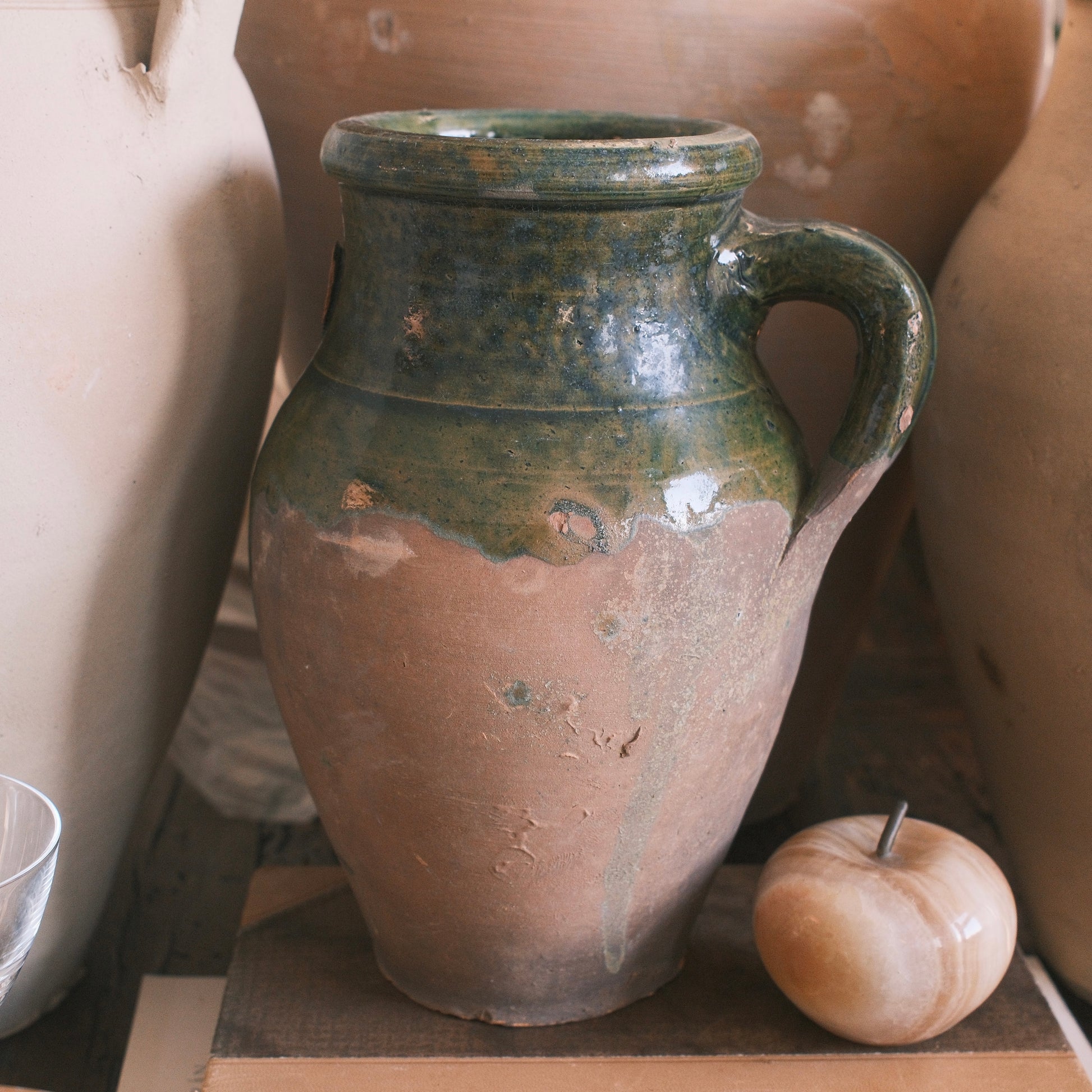 Keramik vas med grön glaserad yta och ett handtag. Alla urnor är unika och kan skifta i färg. De är bara att höra av sig om jag ska ta separata bilder på de som är kvar.