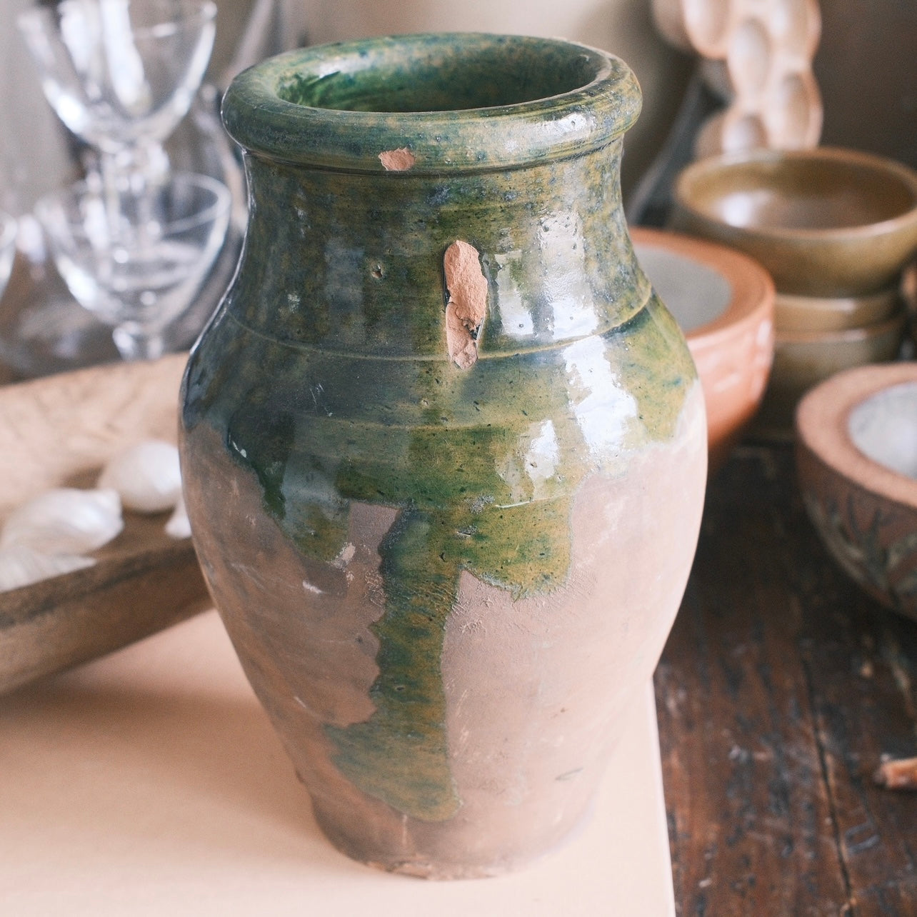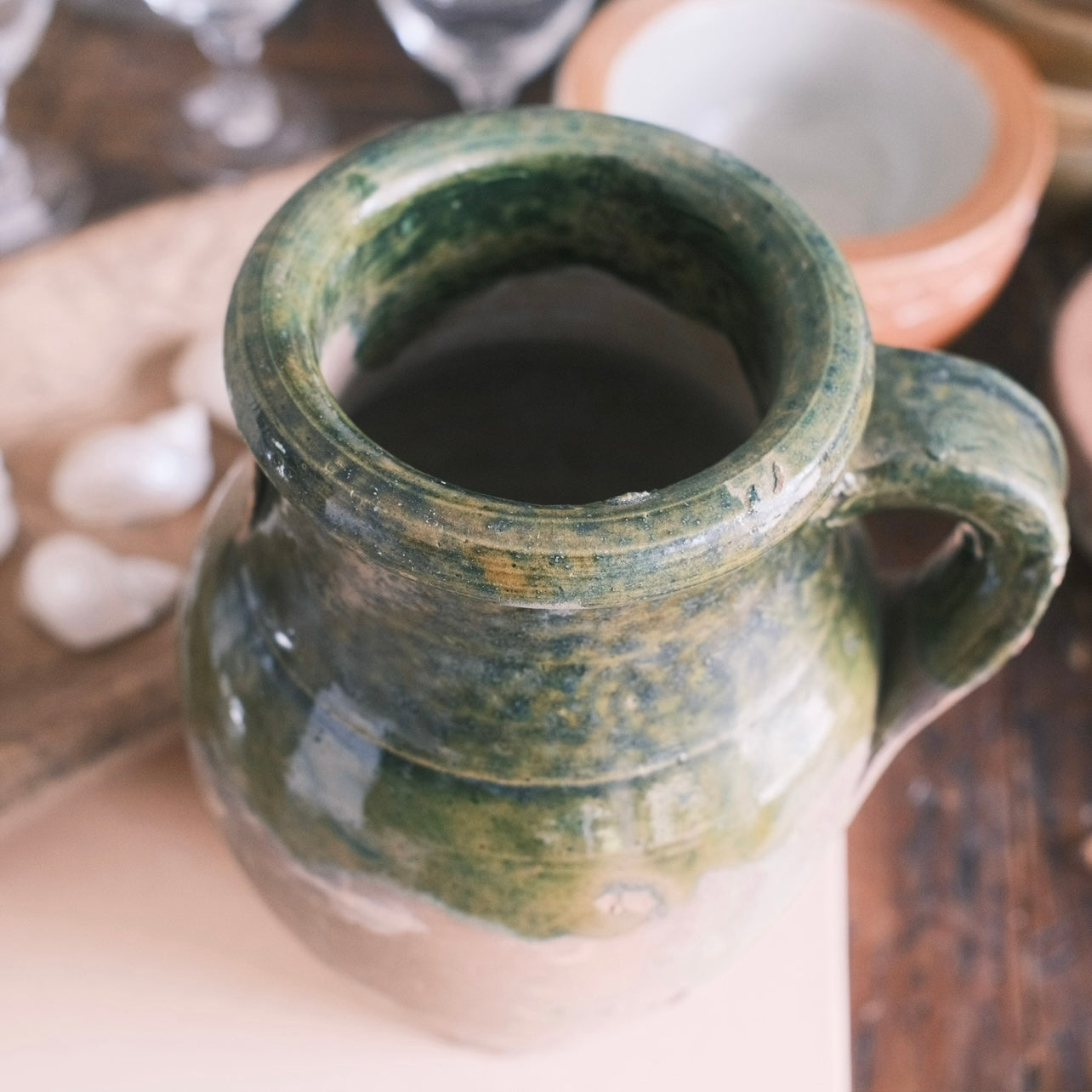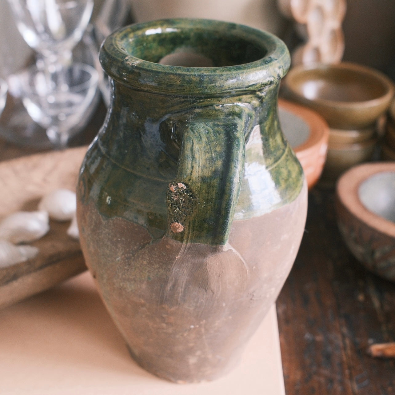 Keramik vas med grön glaserad yta och ett handtag. Alla urnor är unika och kan skifta i färg. De är bara att höra av sig om jag ska ta separata bilder på de som är kvar.
