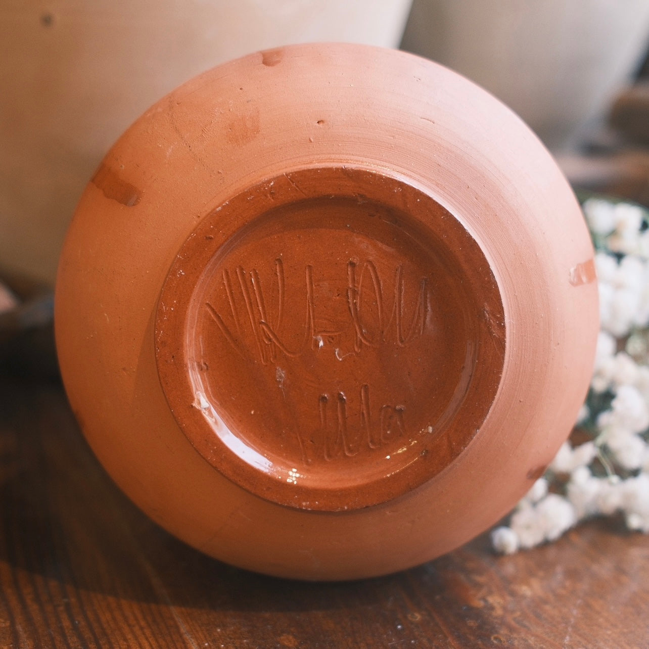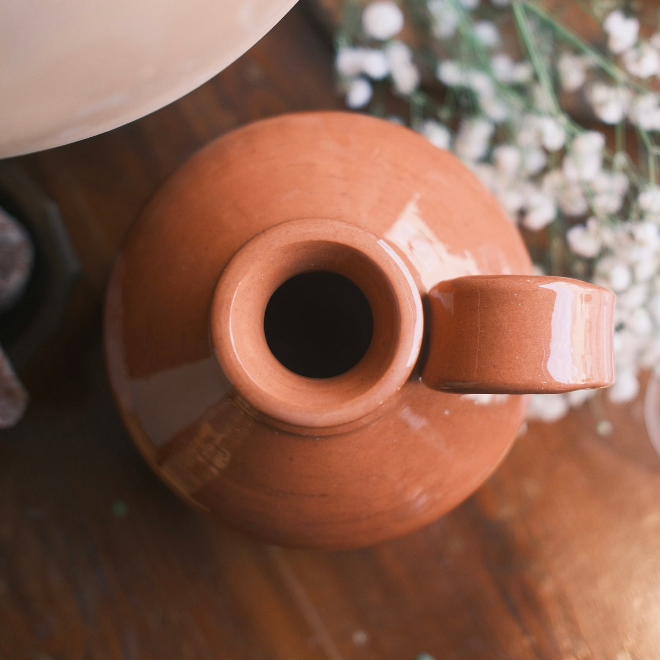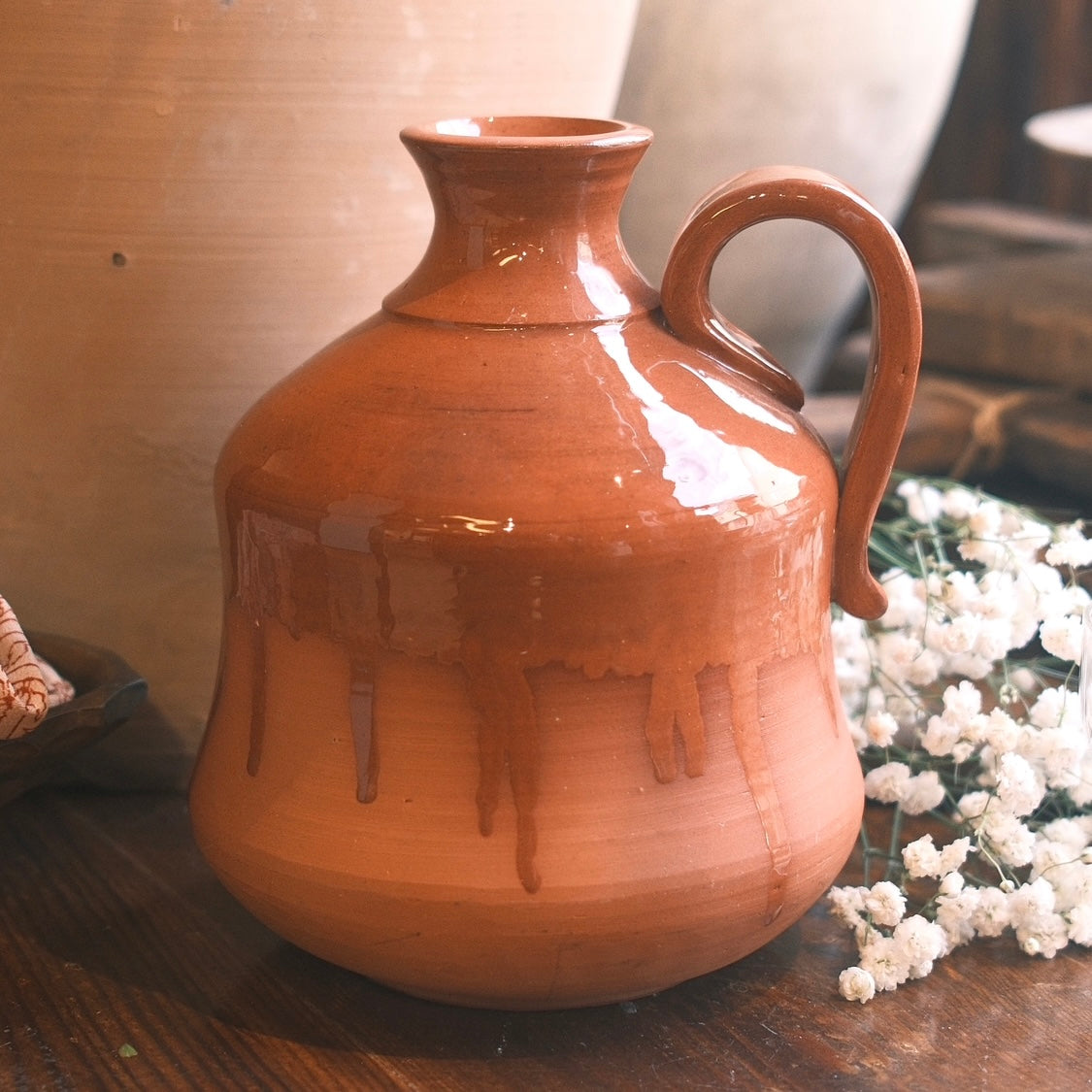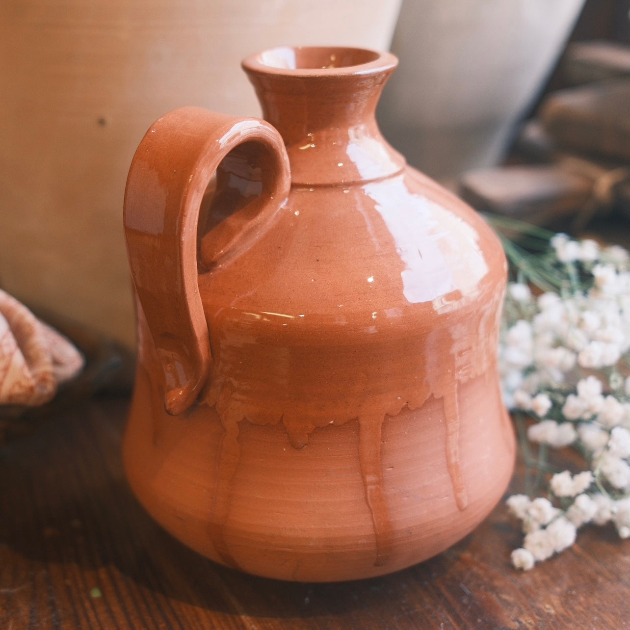 Ett vackert krus i terrakottafärgad ton med rinnande glasyr och ett rejält handtag.