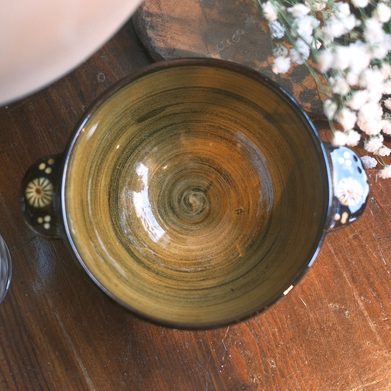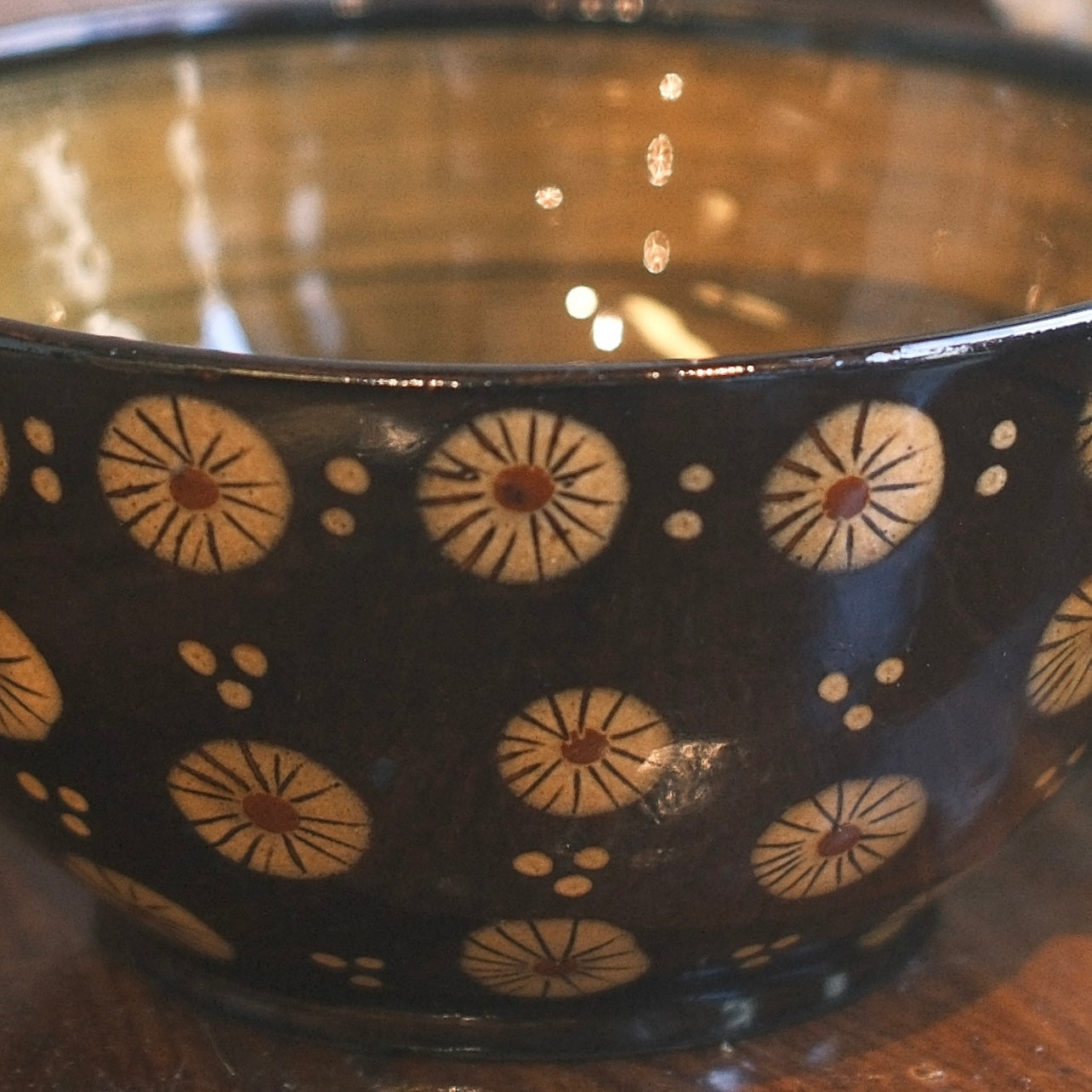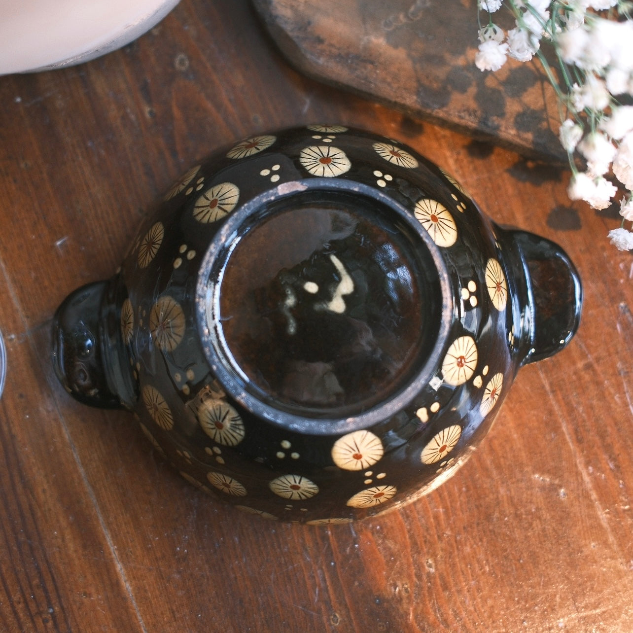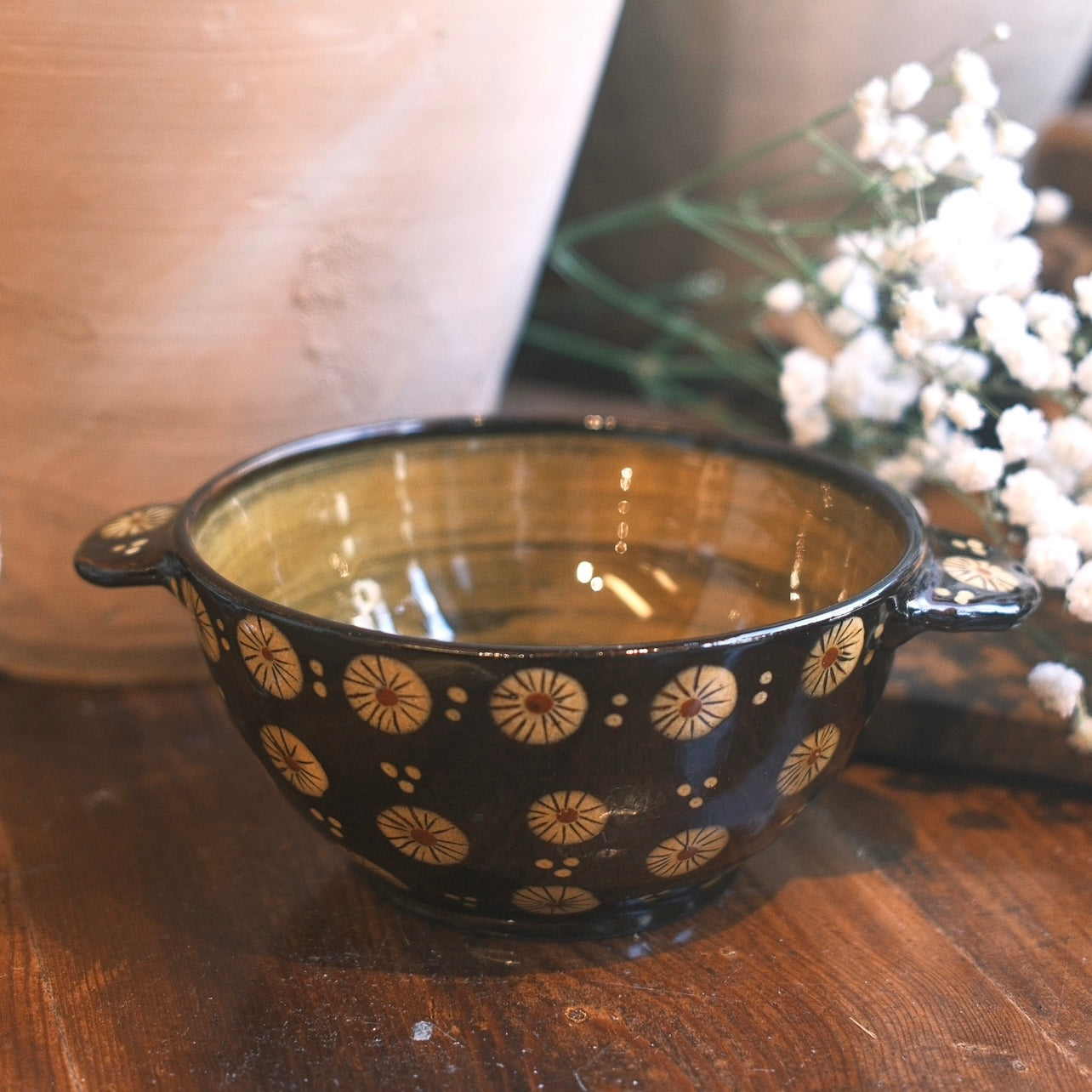 Gullig skål med dekorativa gula blommönster över hela mot en svartbrun botten. Skålen har en gul glaserad insida med 2 handtag där även dom är prydda med blommor och prickar.