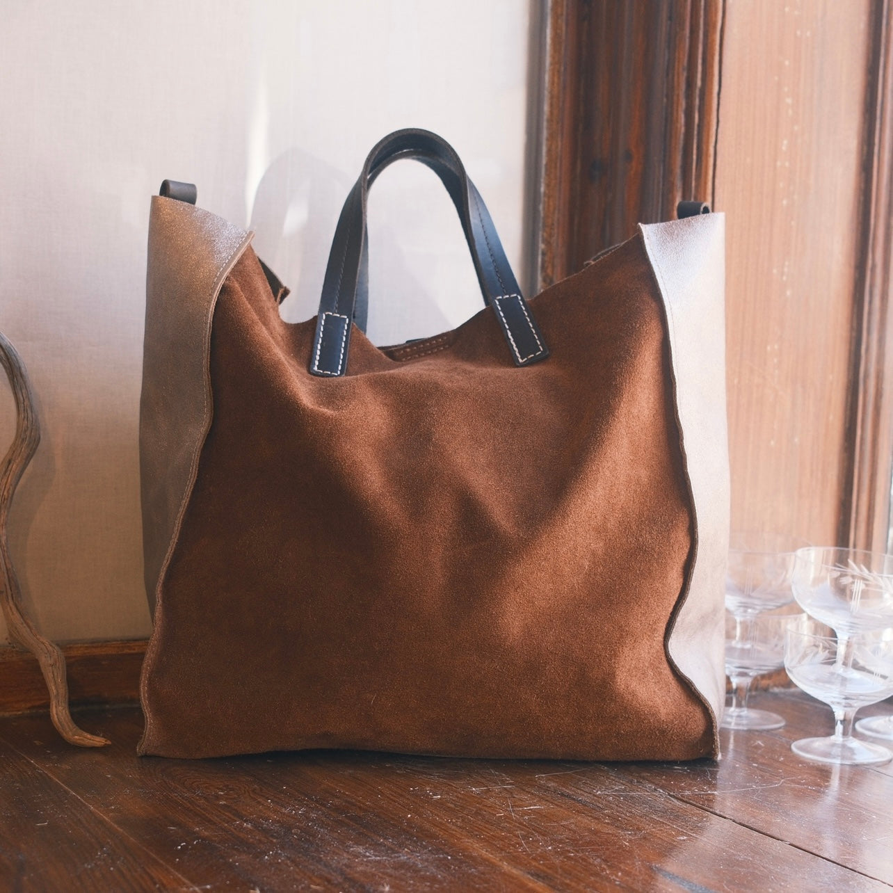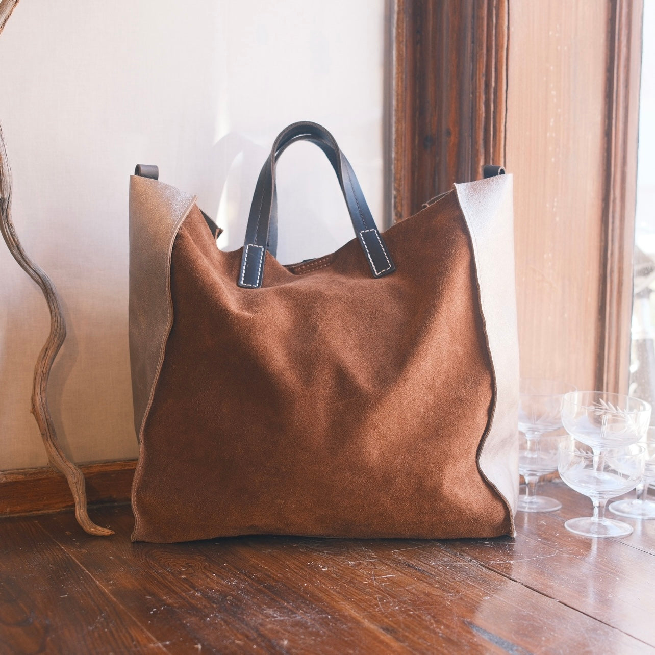 Stor bag i brun mocka med färgad mocka i silver på sidorna. Två handtag i mörkbrunt läder.