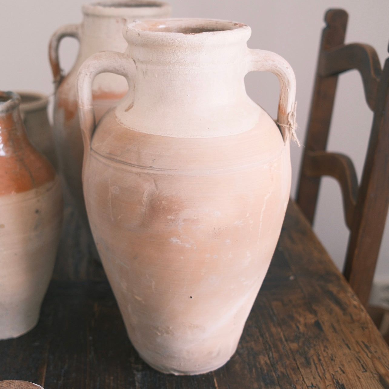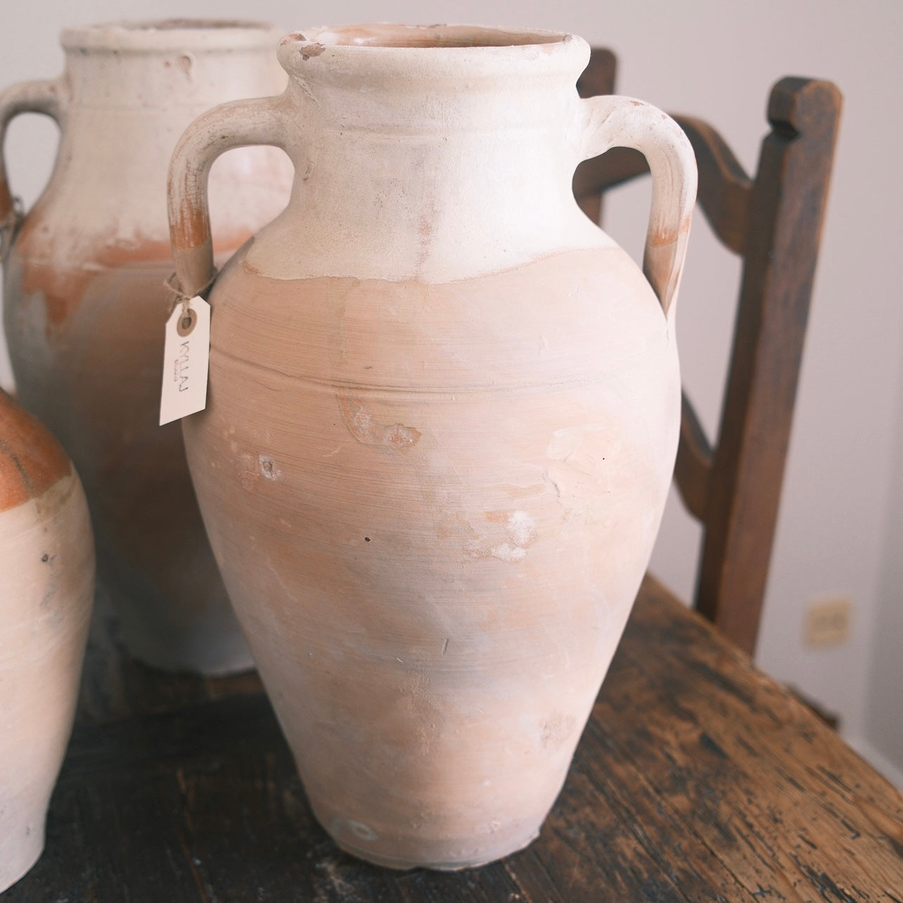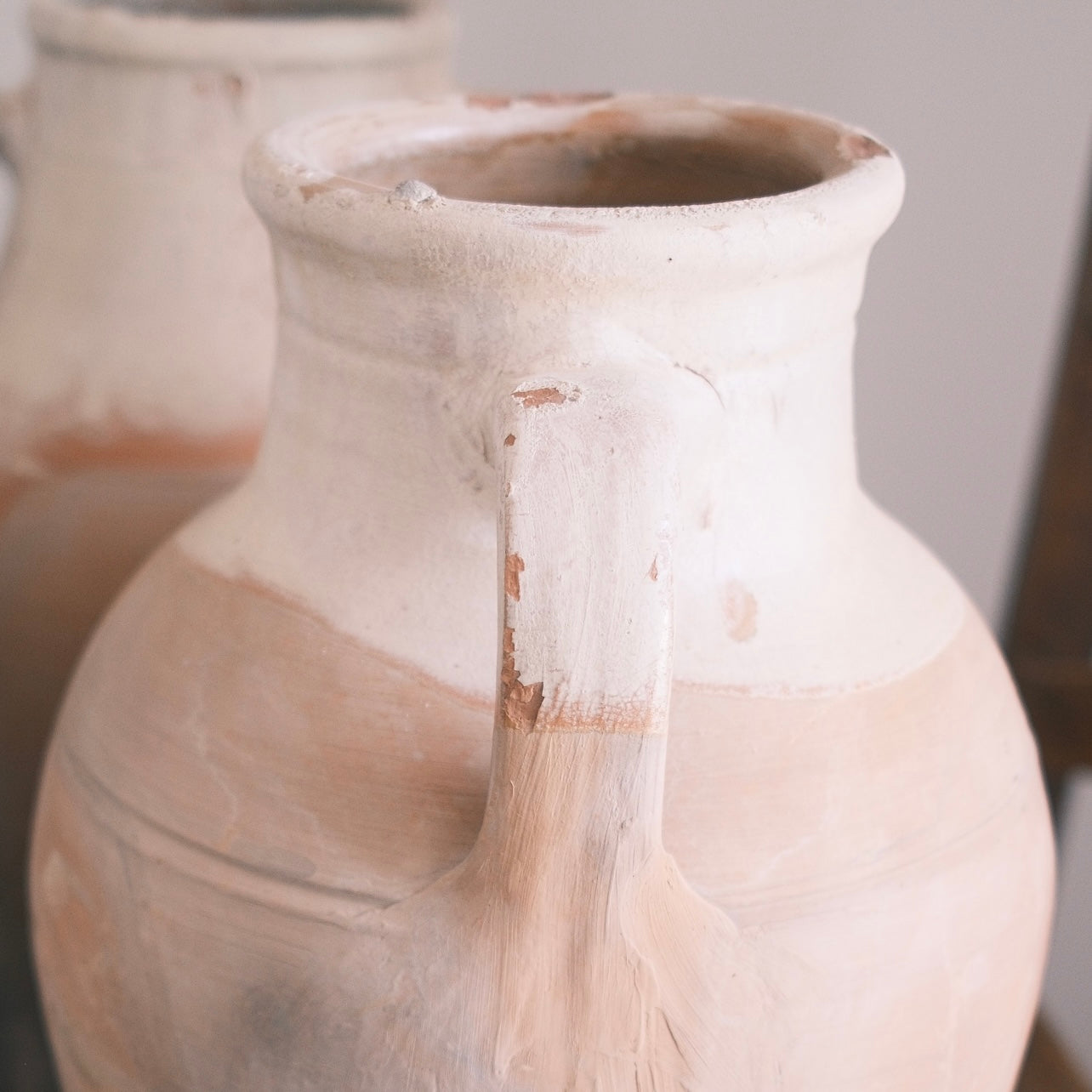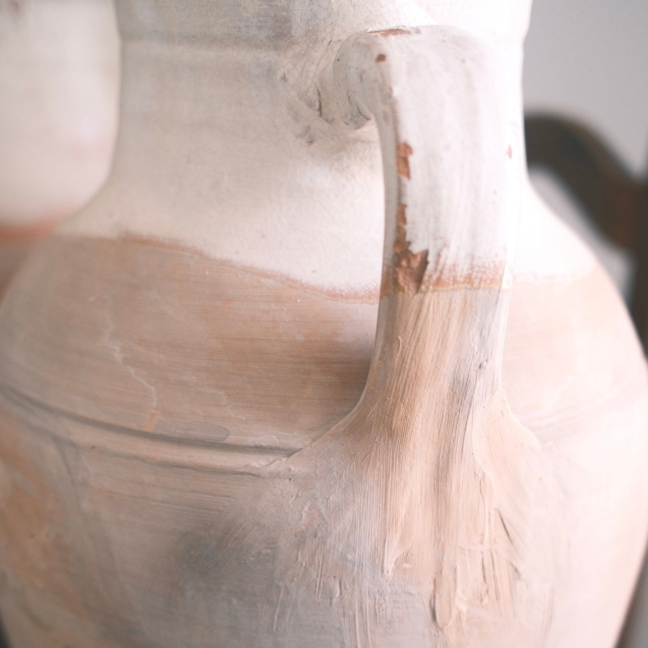 Stor ljus keramik urna med vit glasyr upptill och två handtag. Denna urna passar perfekt för att pryda en skänk, ett bord eller ståendes på golvet. Tänk på att urnorna är unika och kan skifta i färg.
