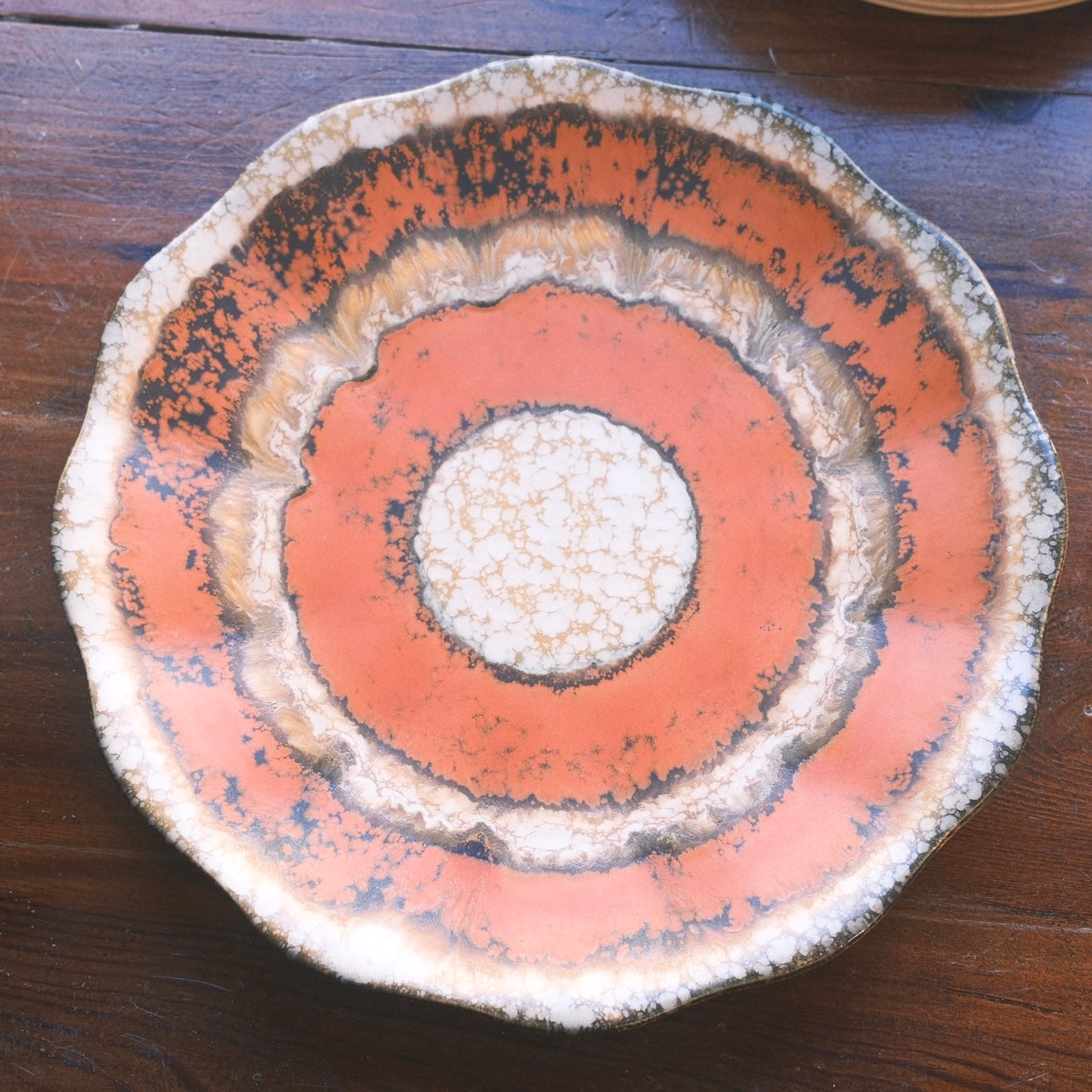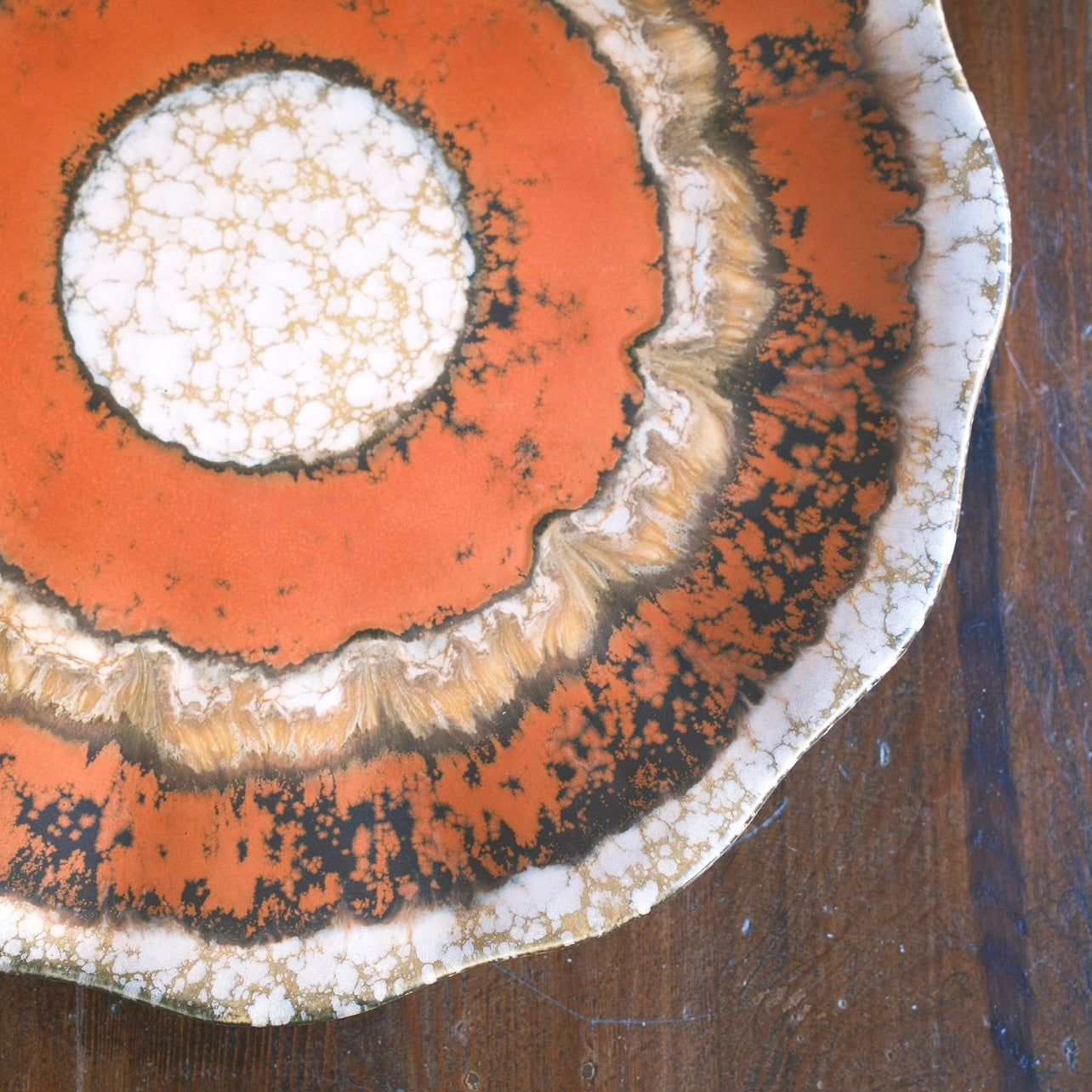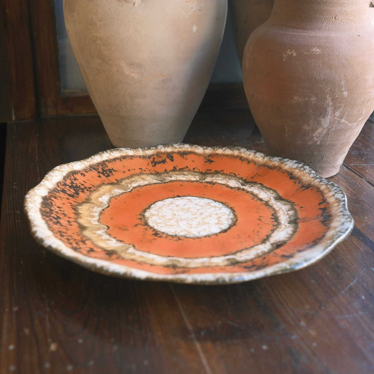 Stort keramik fat med ett dekorativt mönster i oranga, svarta och beiga toner. Fatet har en vågig kant.