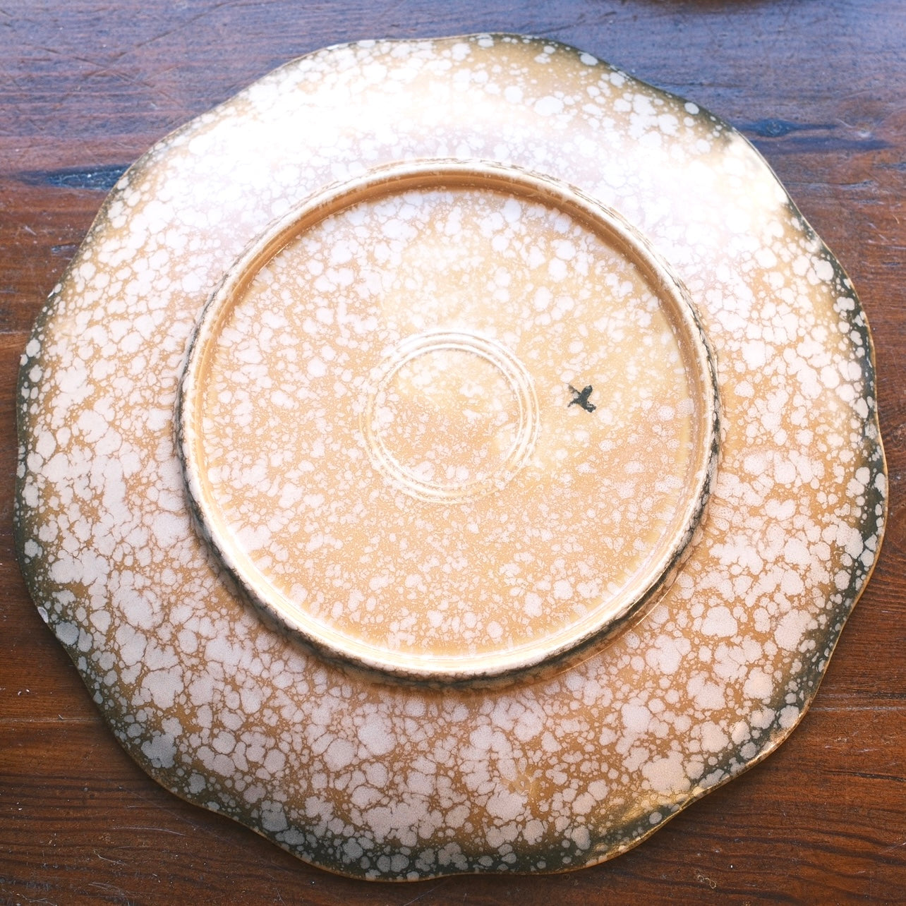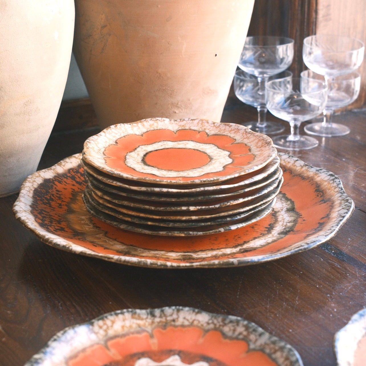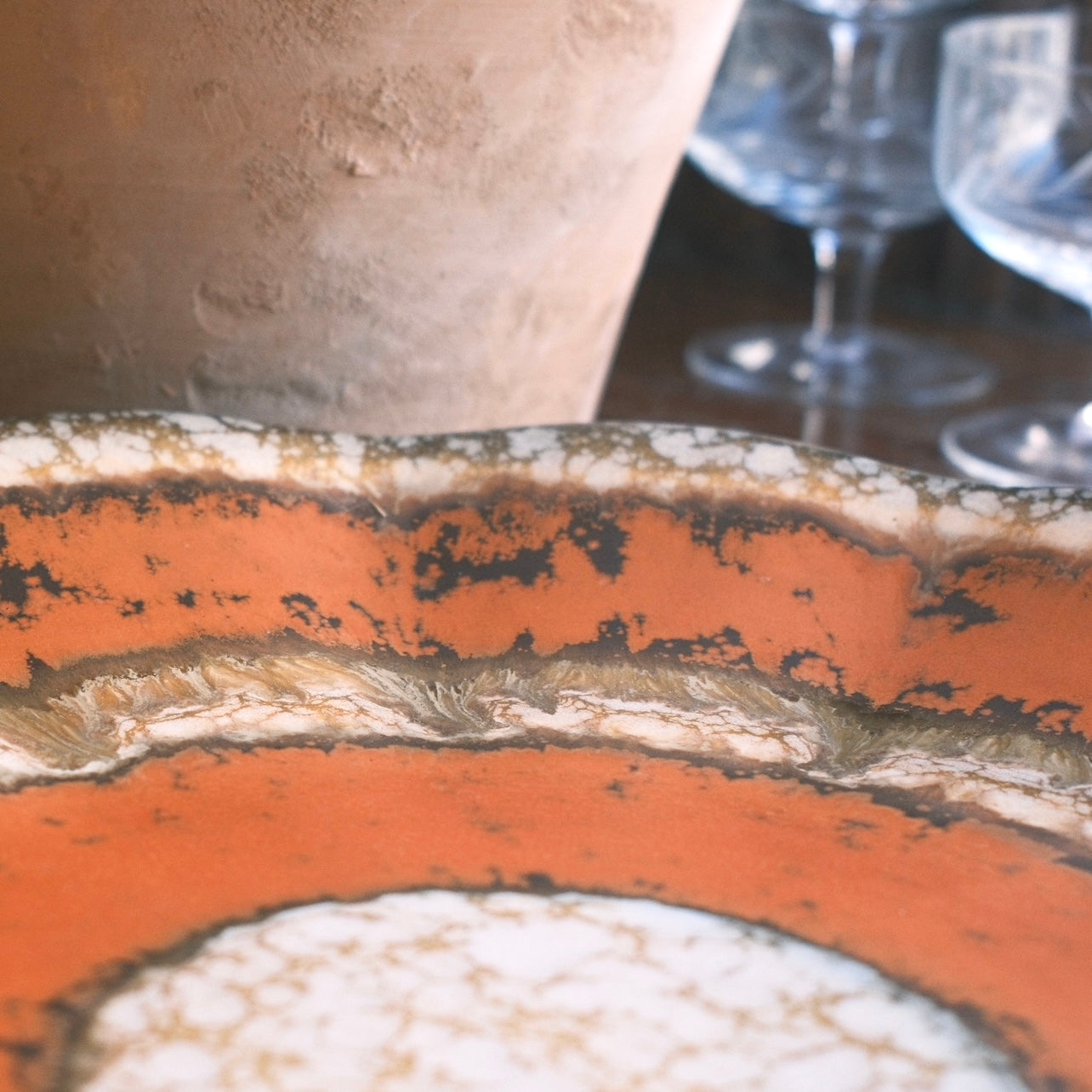 Stort keramik fat med ett dekorativt mönster i oranga, svarta och beiga toner. Fatet har en vågig kant.
