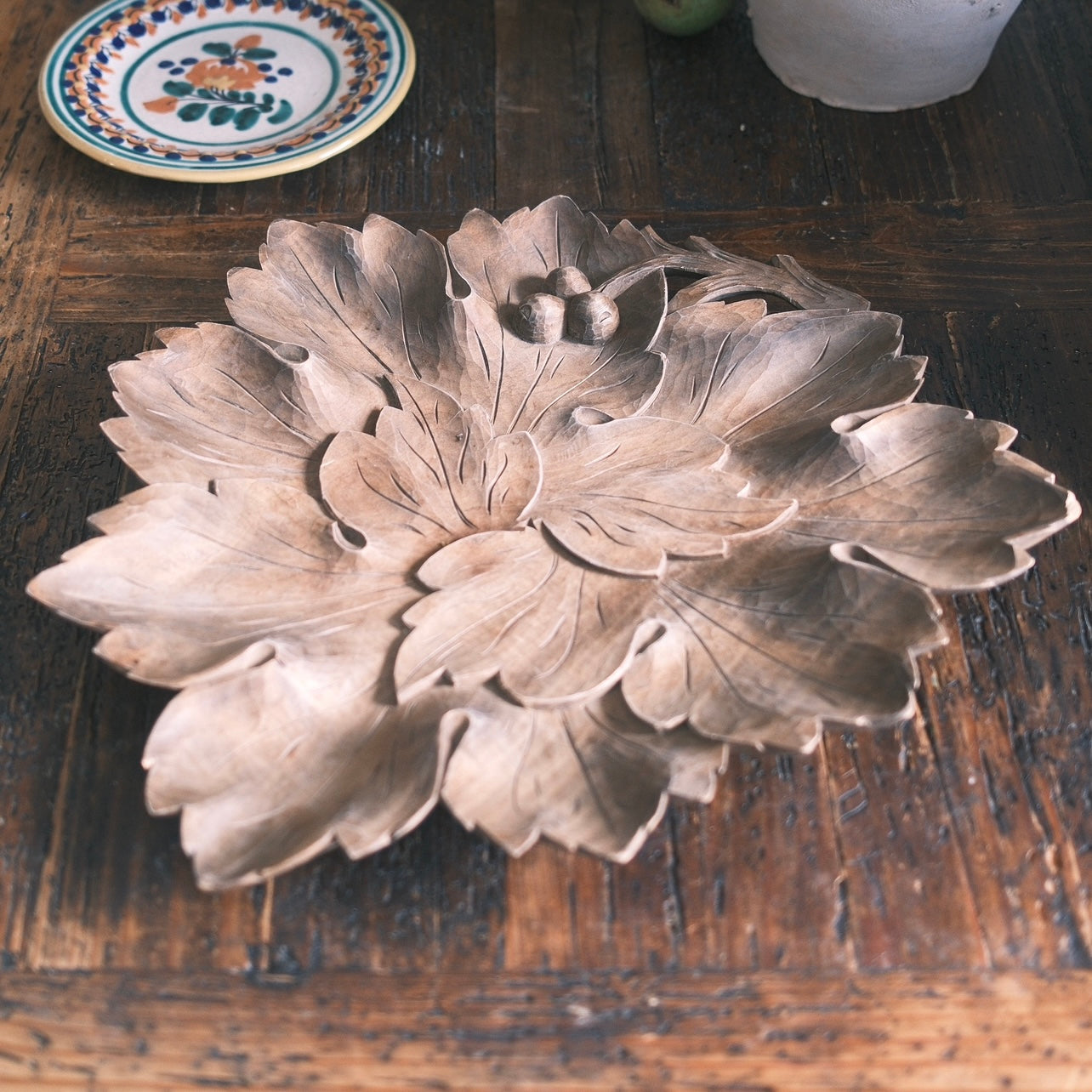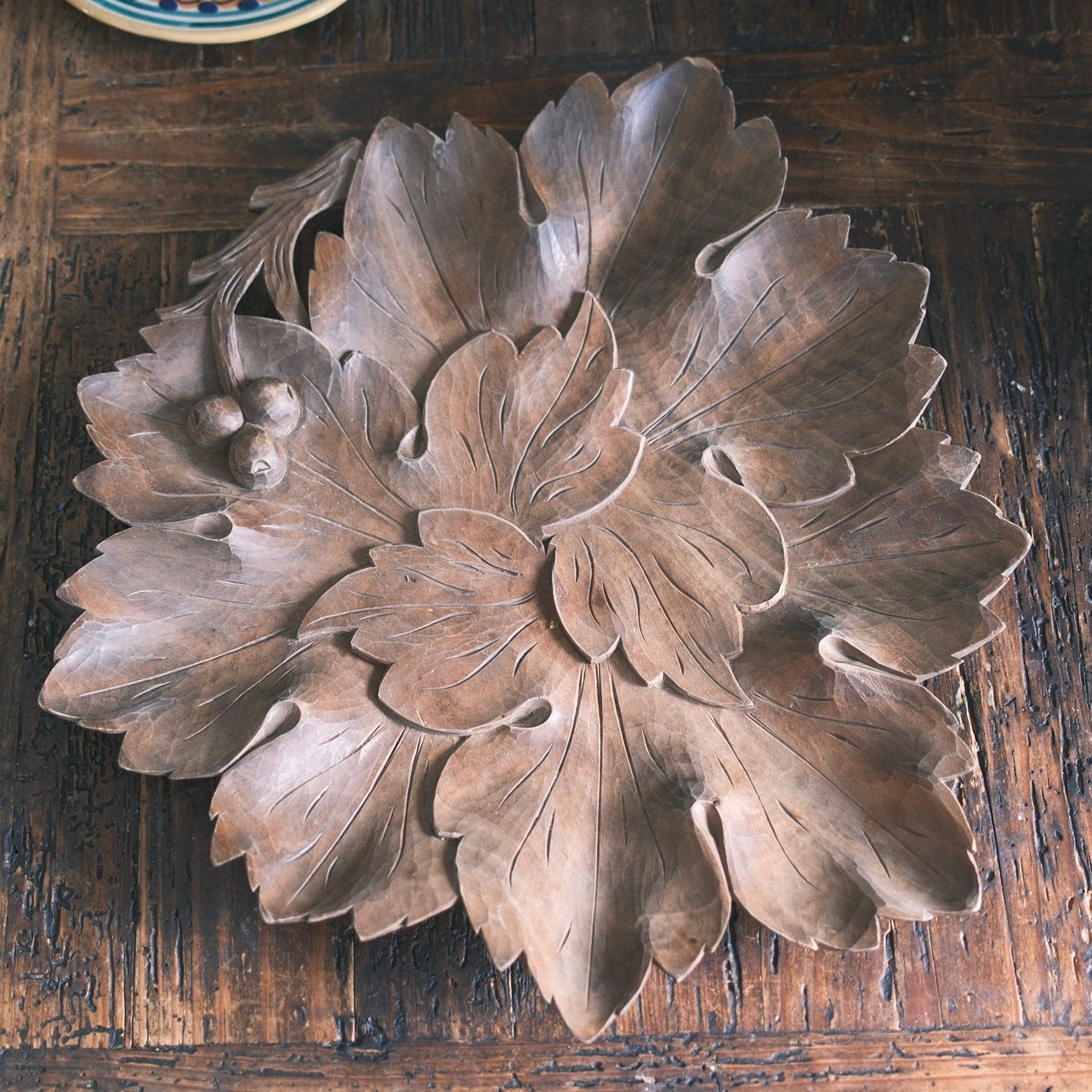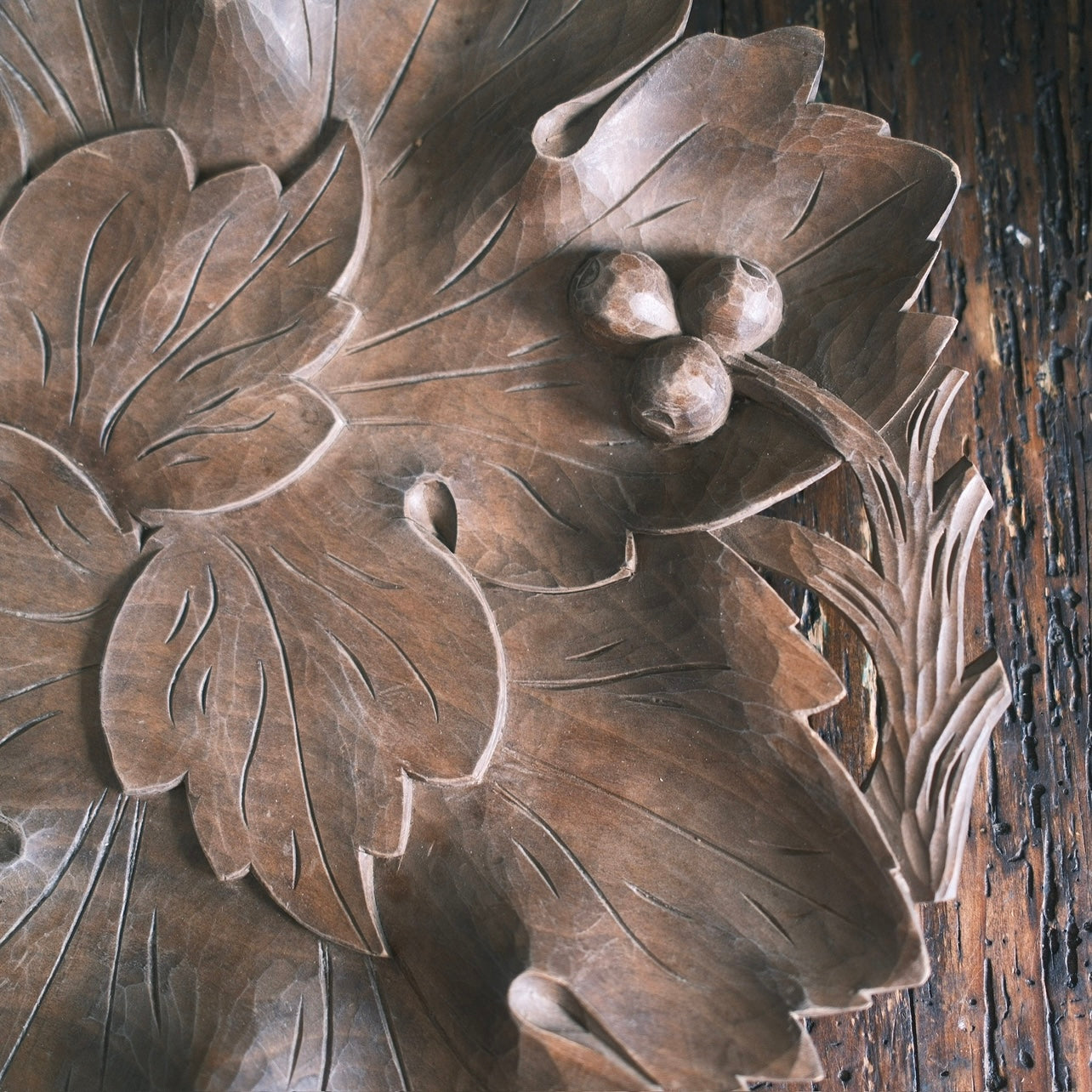 Ett stort träfat med snidade blad som formar ett stort blad. Handtaget är format med dekorativ frukt som sitter på en gren. Så fint att ställa i mot väggen eller använda som fruktfat. En liten skada finns på ett av bladformationen.