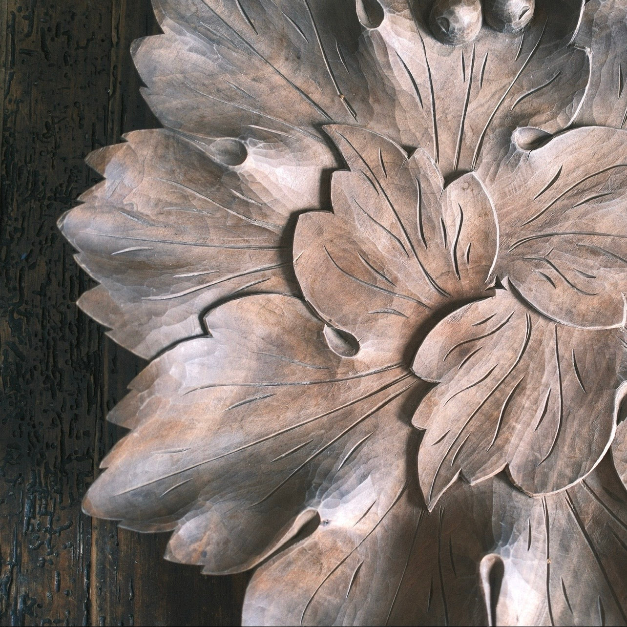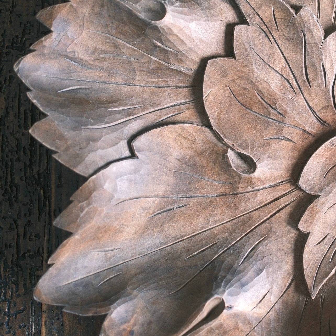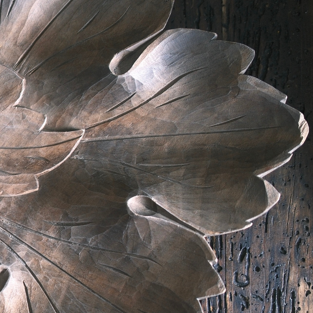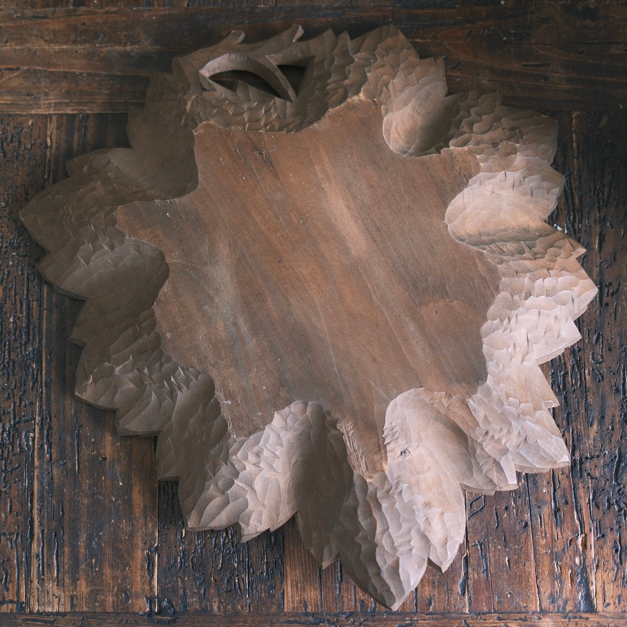 Ett stort träfat med snidade blad som formar ett stort blad. Handtaget är format med dekorativ frukt som sitter på en gren. Så fint att ställa i mot väggen eller använda som fruktfat. En liten skada finns på ett av bladformationen.