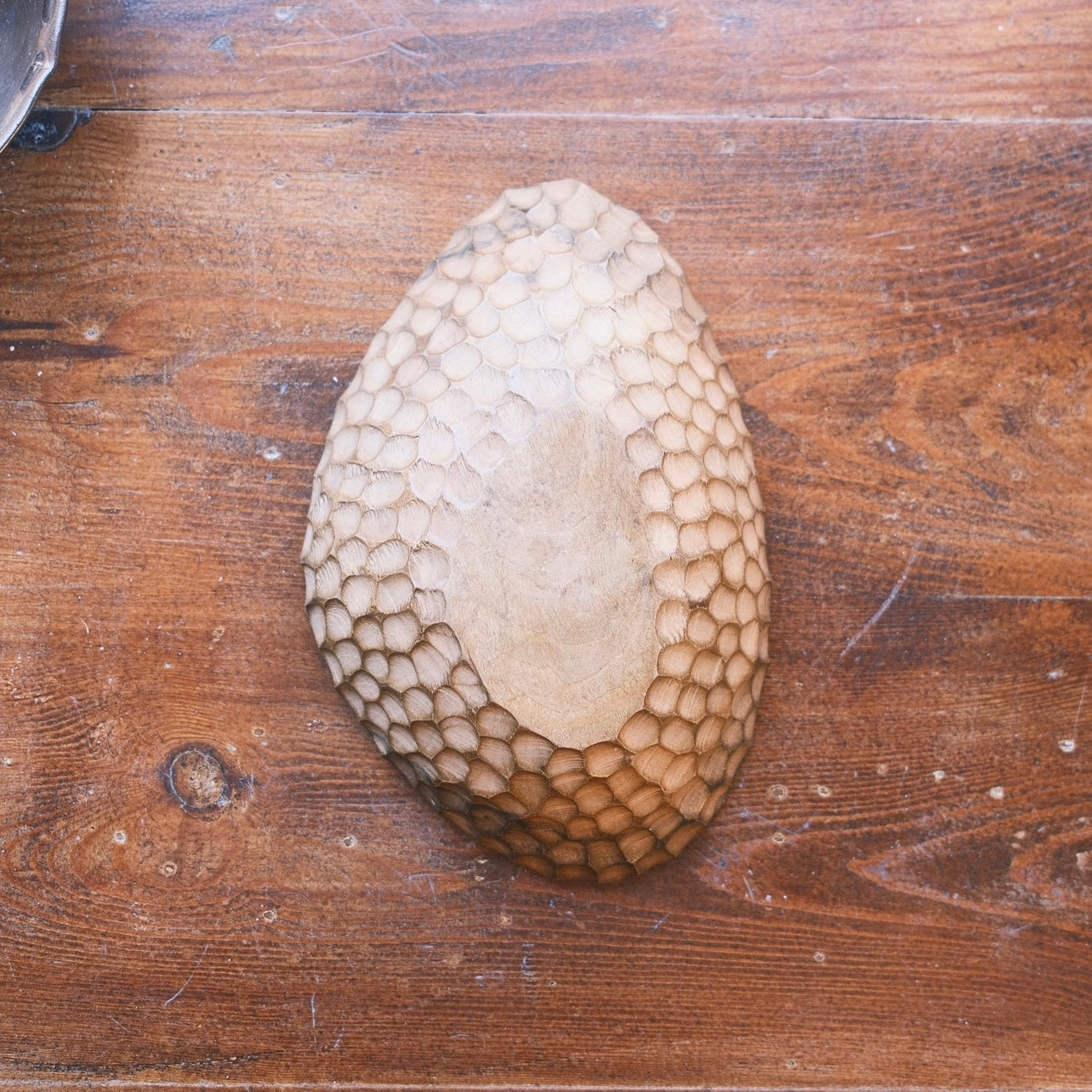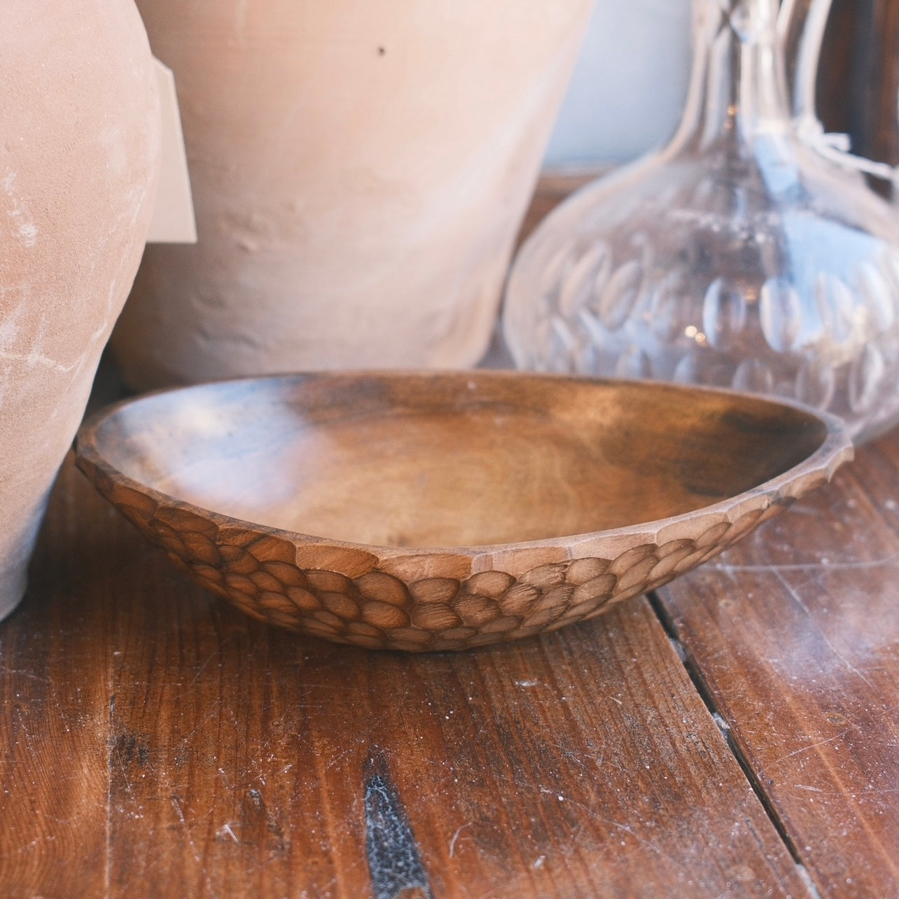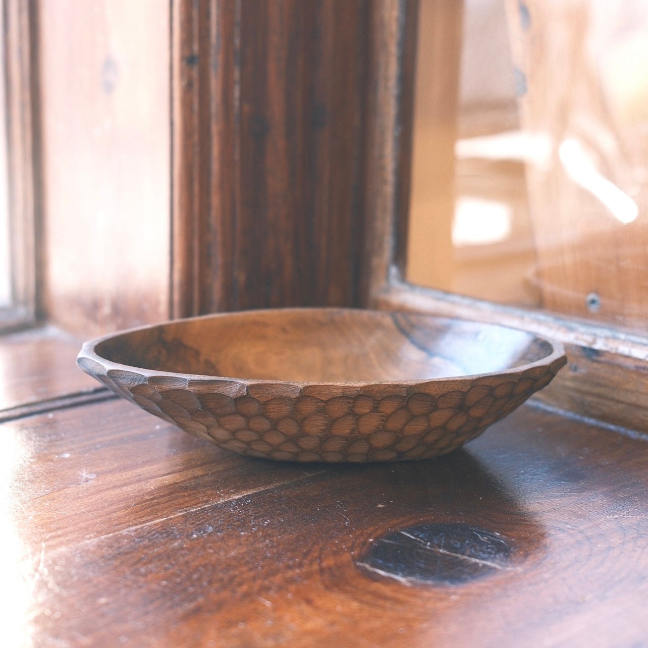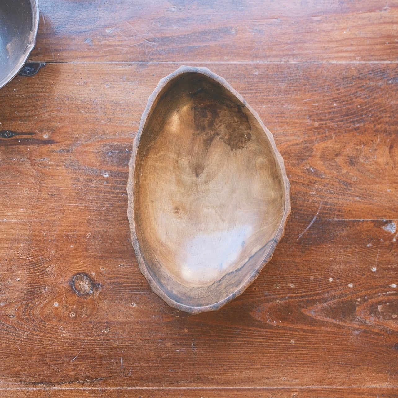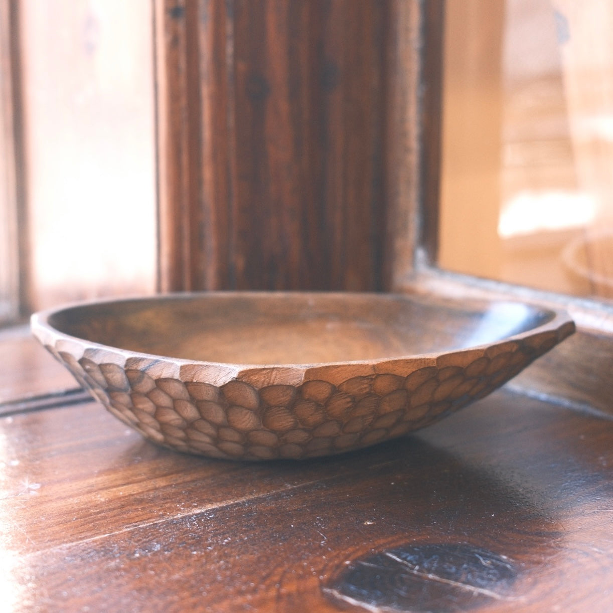 Träskål med strukturmönster i en ovanlig nästan trekantig form.