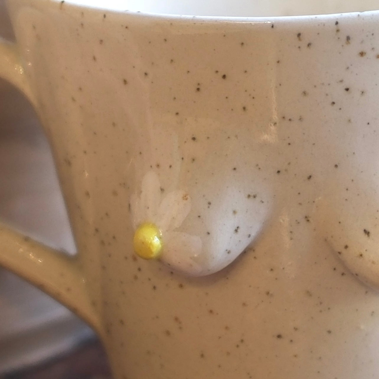 Tuttmugg Te Large - Tuttverkets störta Tuttmugg att fylla med gott varmt te. En perfekt present till en te älskare eller en som dricker en rejäl kopp kaffe. Muggen har tuttar på ena sidan som är prydda med ljust målade blommor med gul mitt och vita blad.