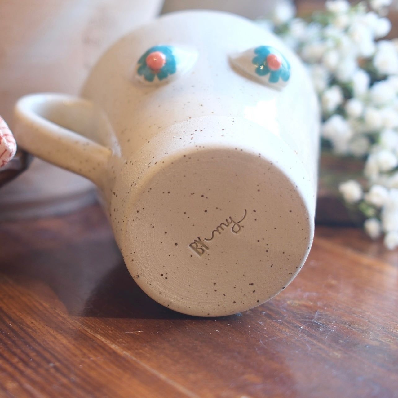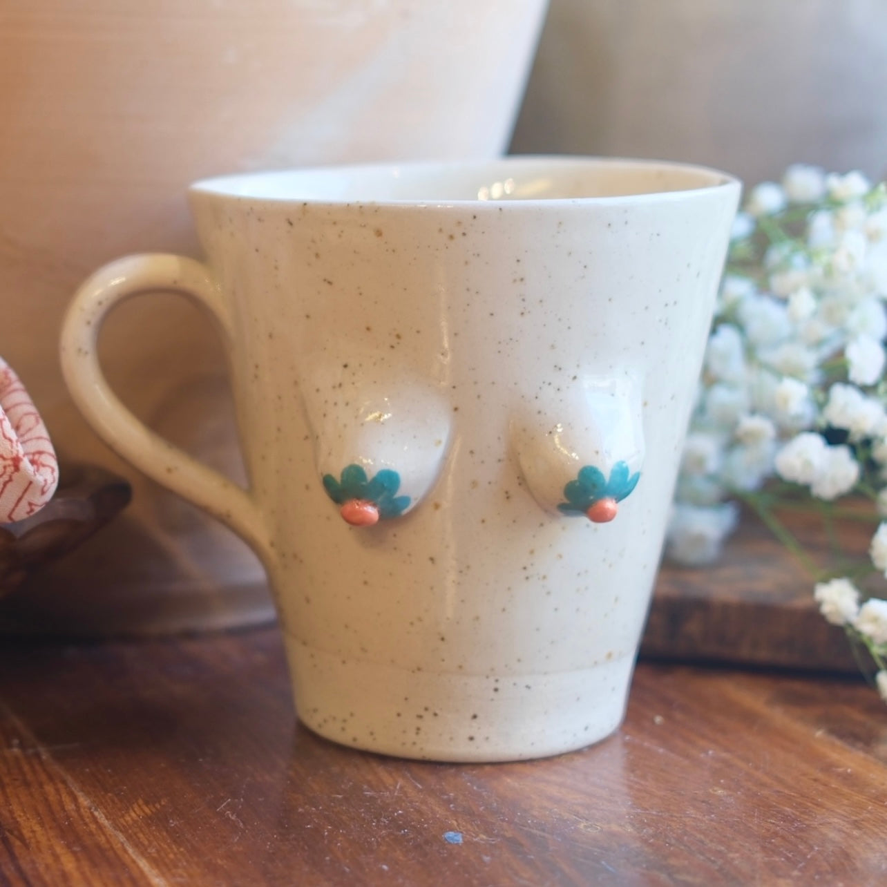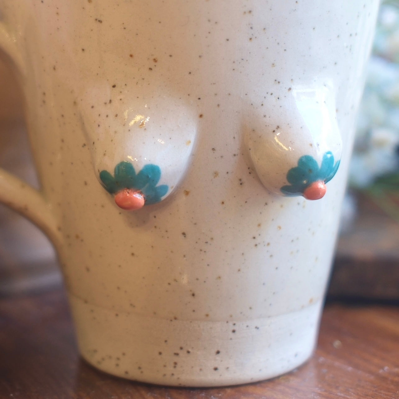 Tuttmugg Te Large - Tuttverkets störta Tuttmugg att fylla med gott varmt te. En perfekt present till en te älskare eller en som dricker en rejäl kopp kaffe. Muggen har tuttar på ena sidan som är prydda med målade blommor med orange mitt och turkosa blad.